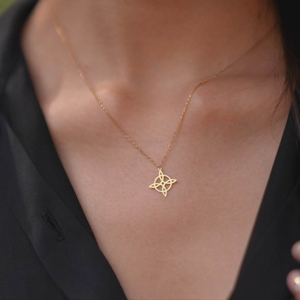 Discover the magic of our Gold Witches Knot Necklace, blending ancient protection symbols with luxurious design. Featuring a 20mm pendant of the witch's knot — a symbol of warding and unity — this piece offers both mystical strength and timeless elegance. Crafted in your choice of 14K solid gold or gold plated over sterling silver, it's a meaningful accessory for those who embrace both beauty and symbolism.