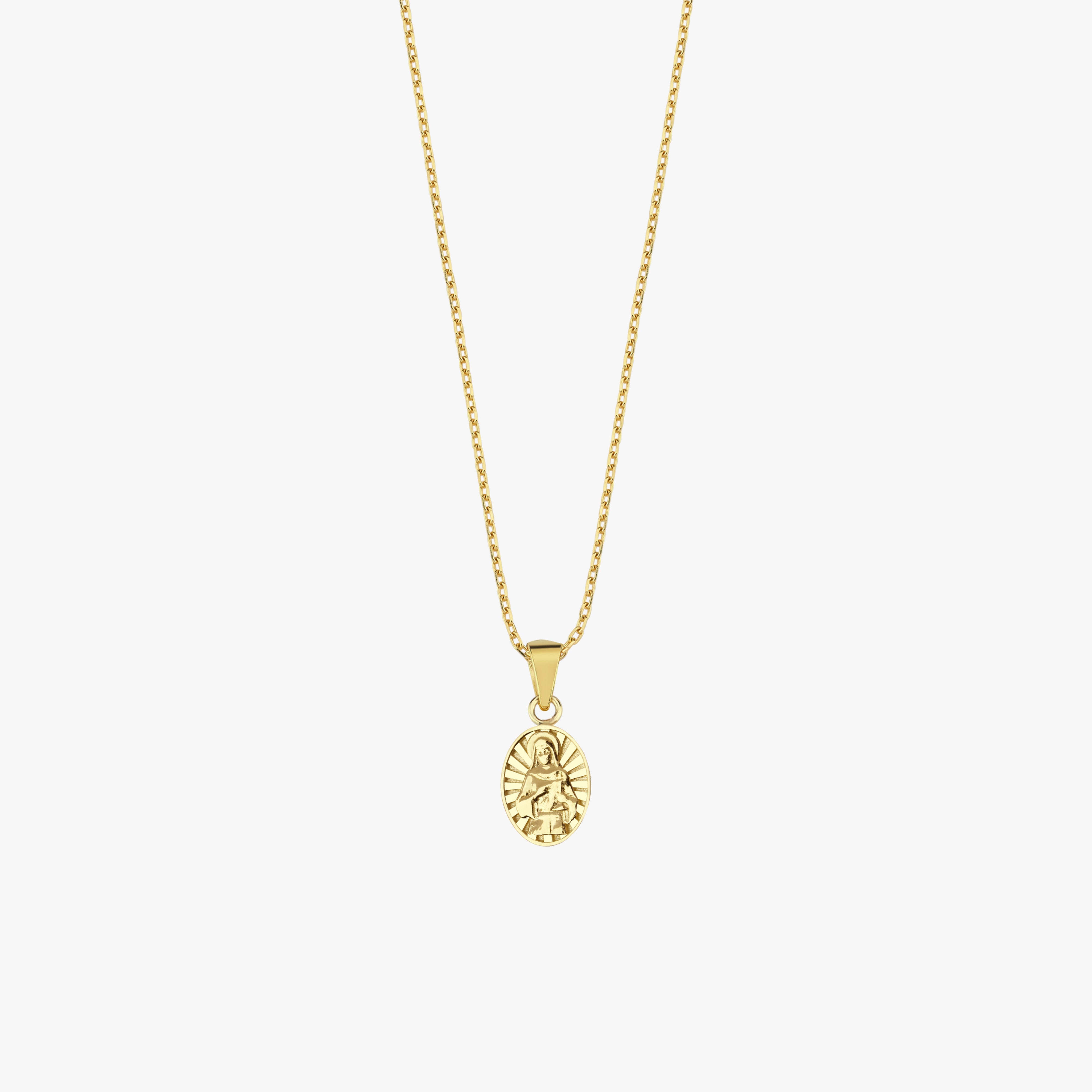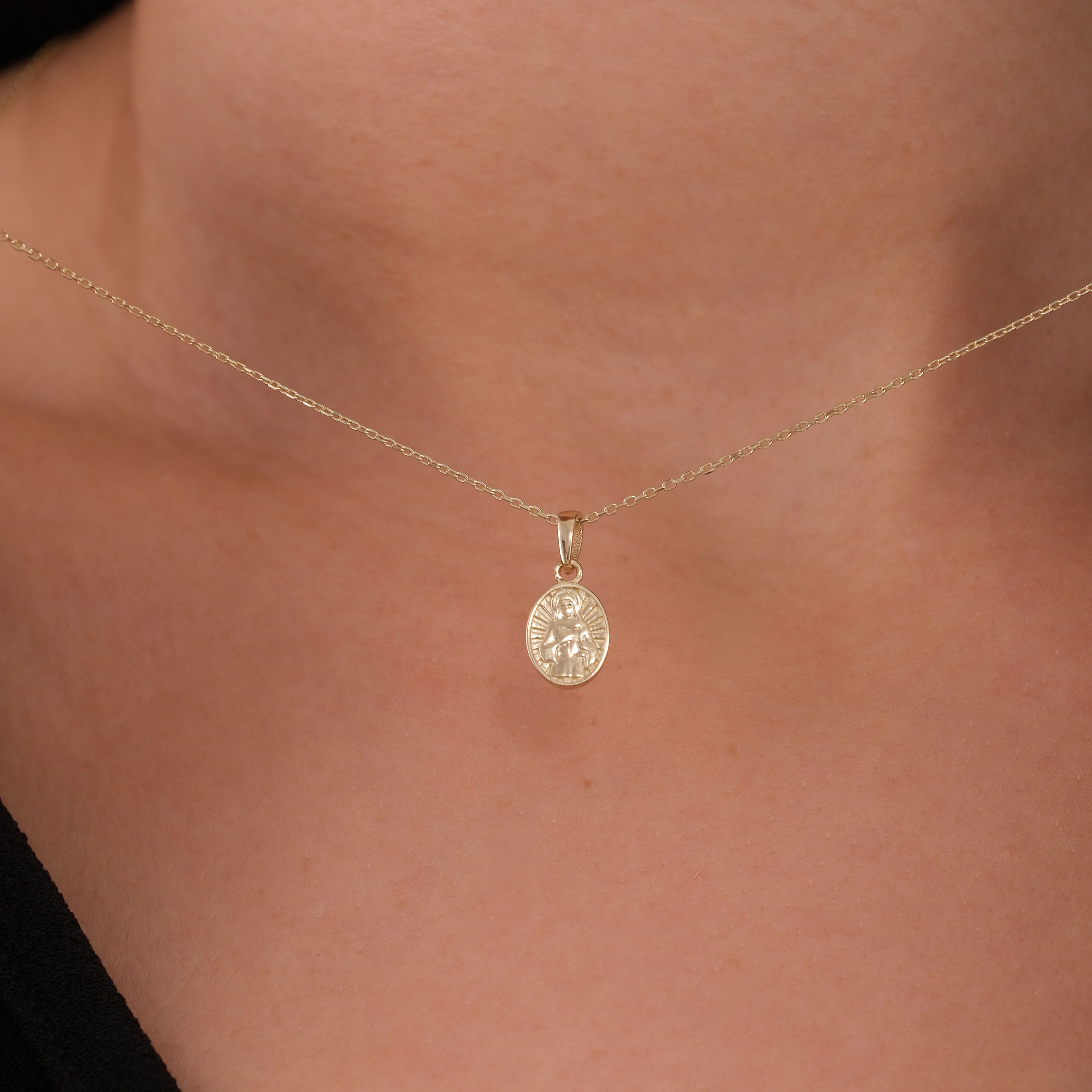 Crafted in 14K solid gold, this St. Catherine medal necklace celebrates the patron saint of wisdom, courage, and faith. A meaningful piece of Catholic jewelry, perfect for inspiration and devotion.