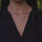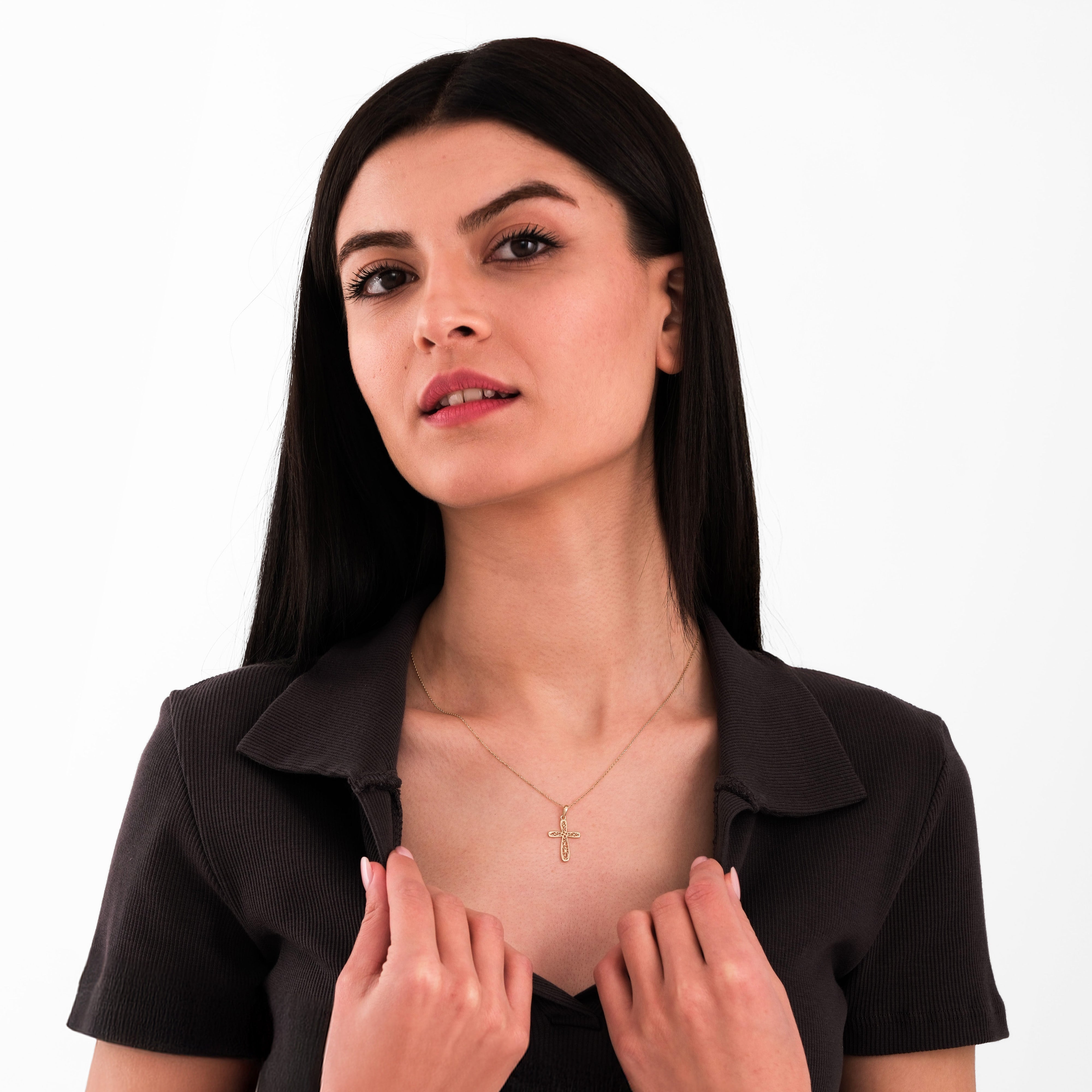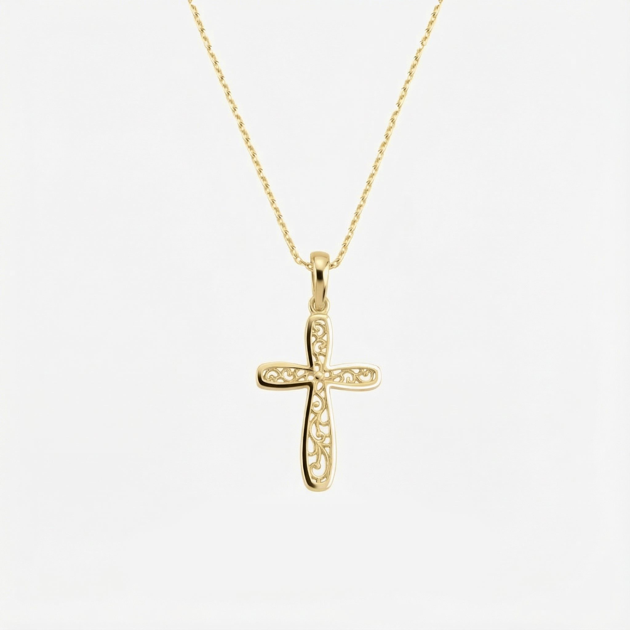 A Greek pattern cross necklace featuring an elegant floral design, offering a unique blend of grace and symbolism. Crafted in your choice of 14K solid gold or gold plated over sterling silver, this piece is perfect for both everyday wear and special occasions. The cross pendant measures 27mm in height and 15mm in width, making it a standout yet timeless accessory.