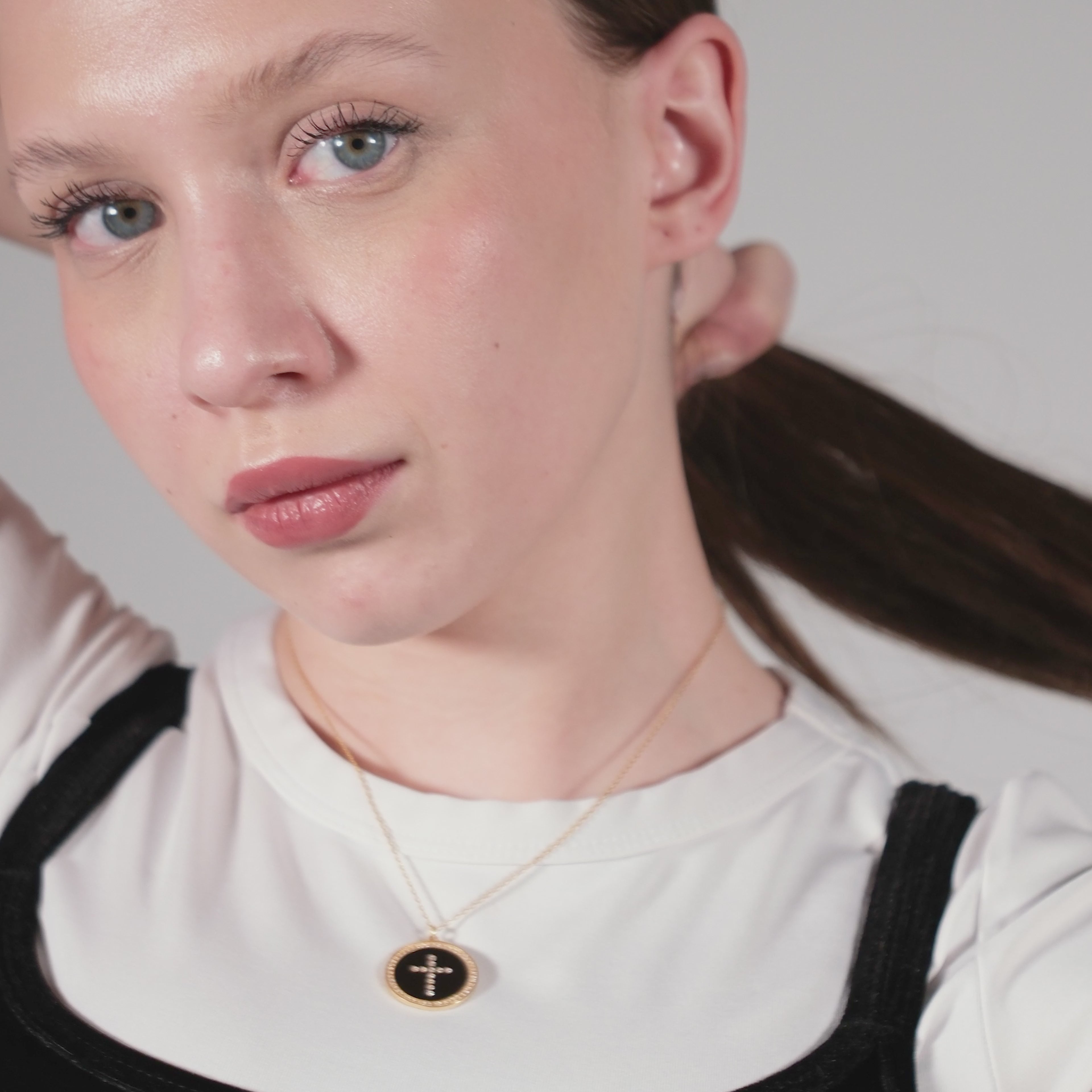 This Cross Coin Necklace showcases a beautifully detailed cross design set against a deep black backdrop, elegantly complemented by radiant 18K gold vermeil. The 22mm medallion serves as a refined expression of faith, offering both style and spiritual symbolism. Sophisticated and meaningful, this necklace is a perfect choice for women seeking elegant, faith-inspired jewelry.