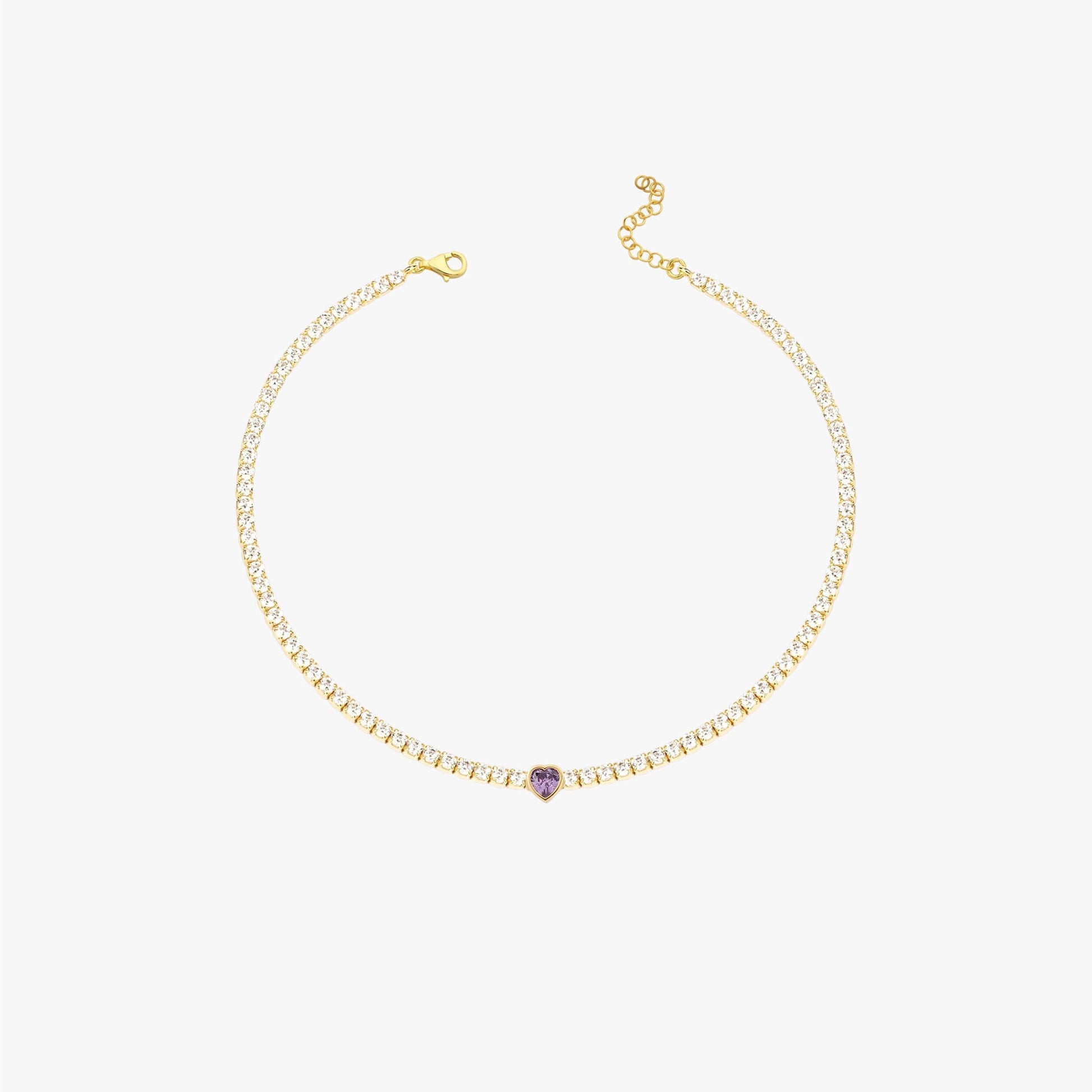 This 18K yellow gold vermeil tennis bracelet modernizes a classic design, featuring a stunning purple heart-shaped centerpiece. Perfect as wedding jewelry or an elegant statement piece, its shimmering stones and gold finish blend traditional elegance with a romantic allure.
