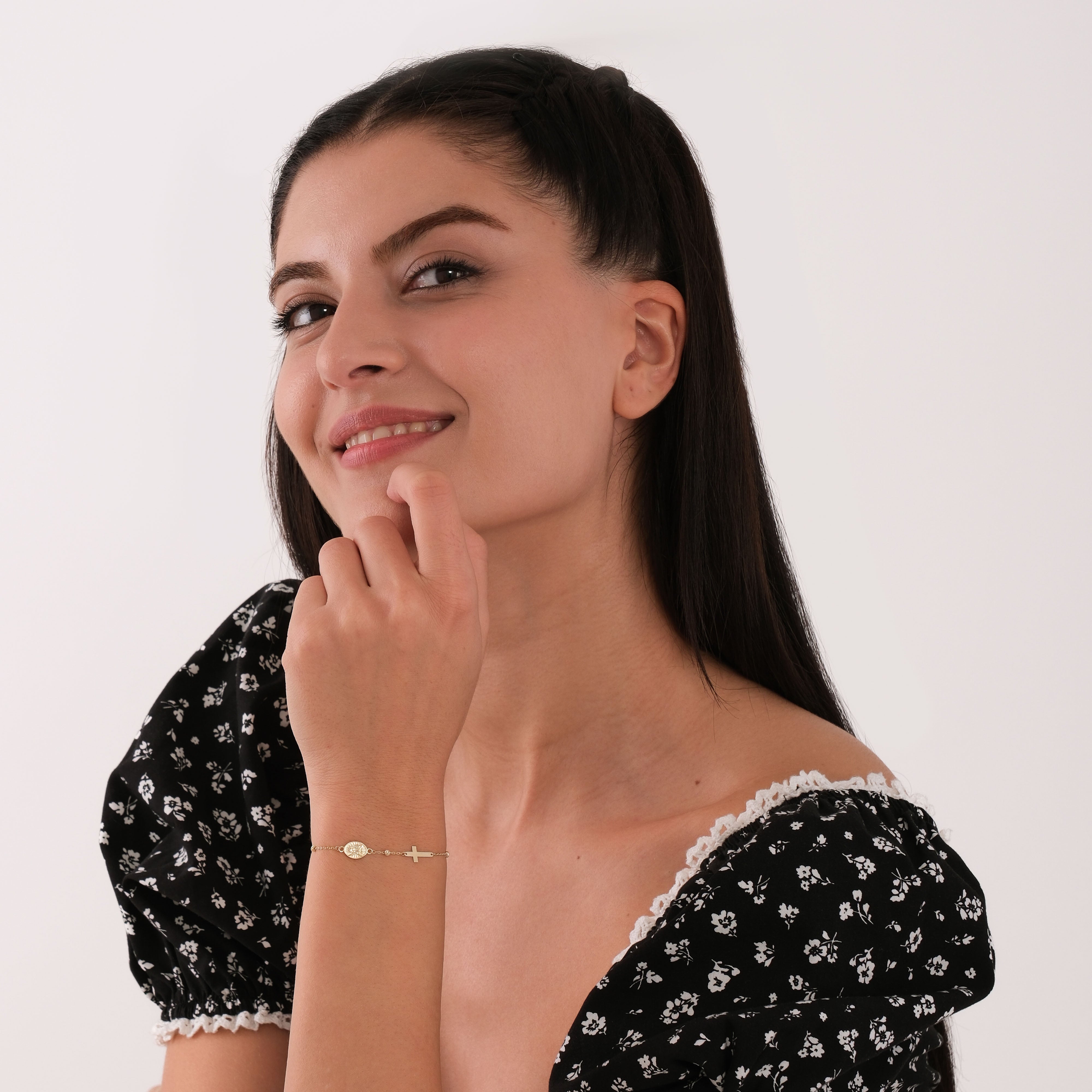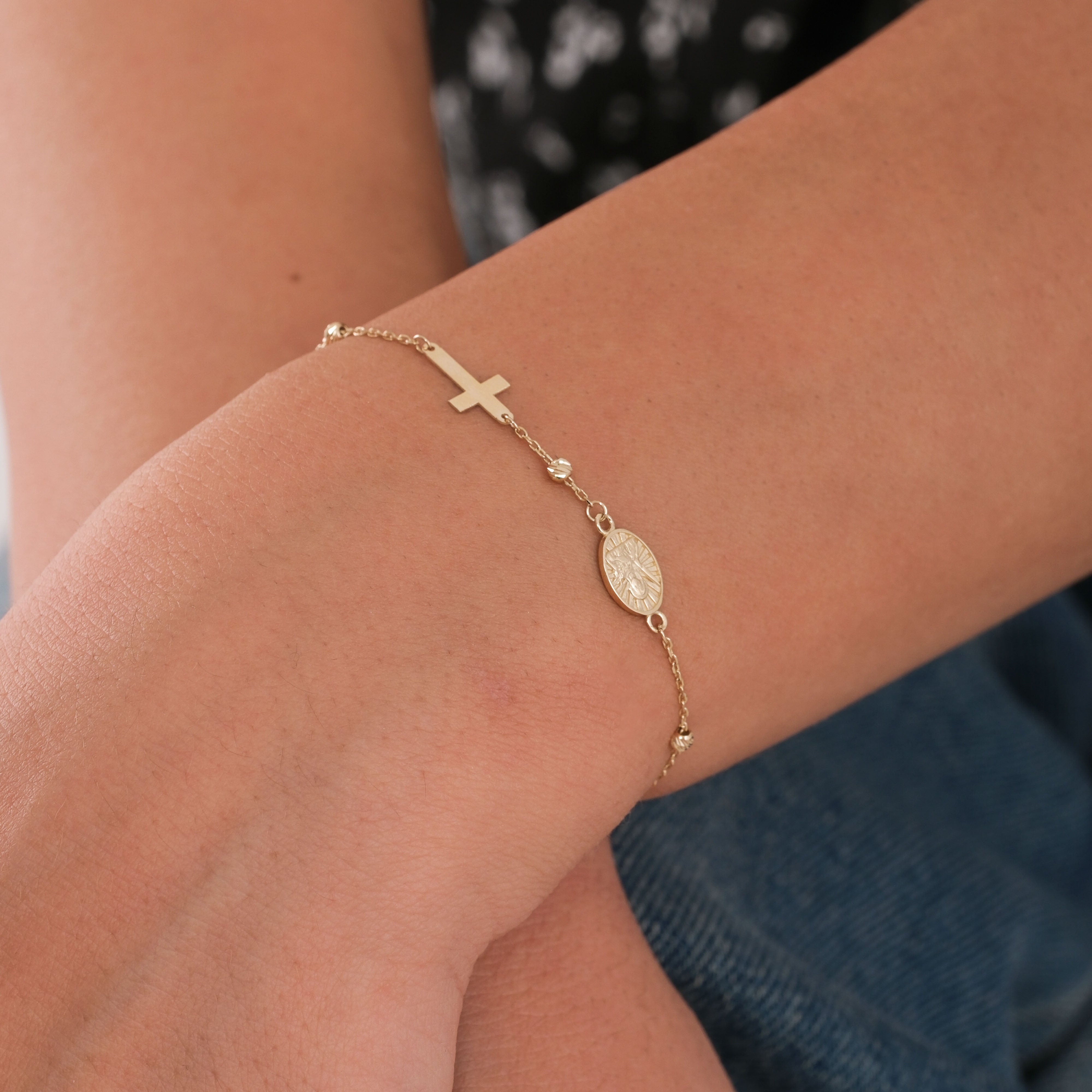 Crafted from 14K solid gold, this St. Elizabeth Catholic bracelet features a beautifully engraved medal and a sleek cross, symbolizing faith, kindness, and devotion. Inspired by the beloved saint known for her charity, this bracelet is perfect for daily wear or meaningful gifting. Its adjustable chain ensures a comfortable and elegant fit for any wrist.