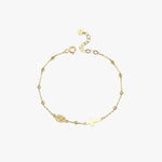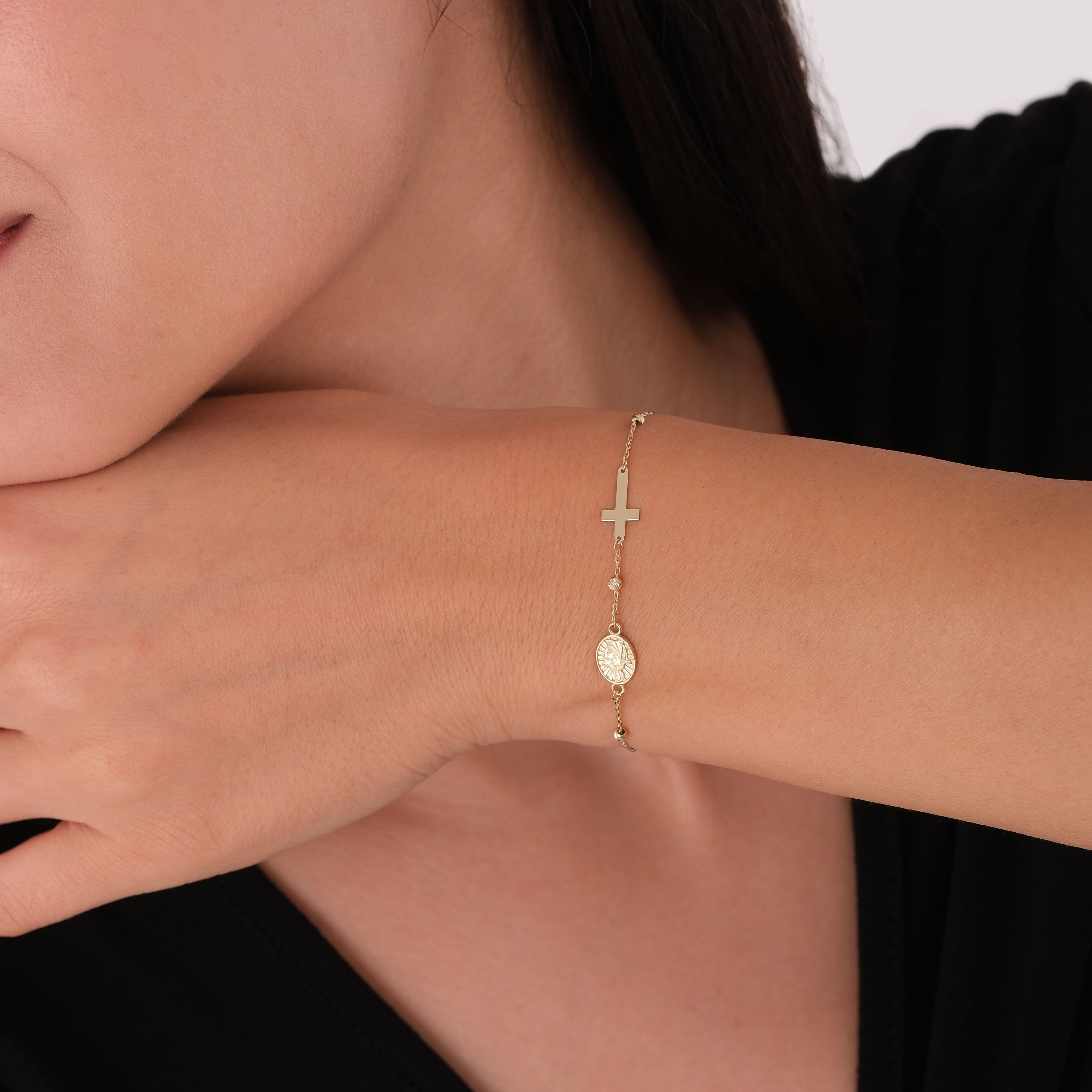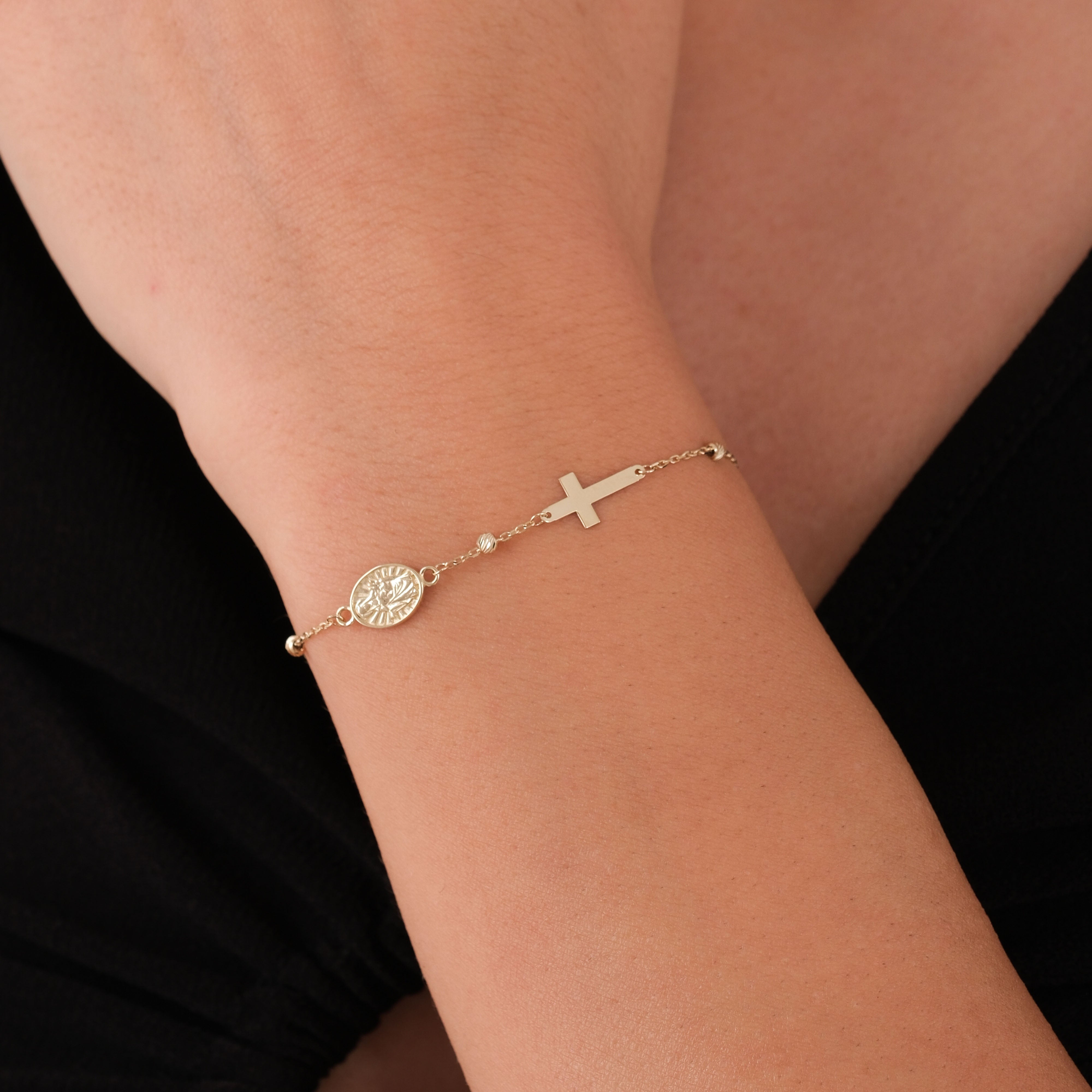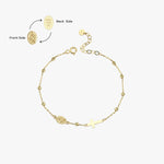 This 14K solid gold St. Maria Goretti Catholic bracelet features a delicately engraved medal and a minimalist cross, honoring the young saint known for her purity, forgiveness, and unwavering faith. Perfect for daily wear or as a meaningful gift, this bracelet offers both elegance and spiritual depth. The adjustable chain ensures a comfortable and graceful fit.