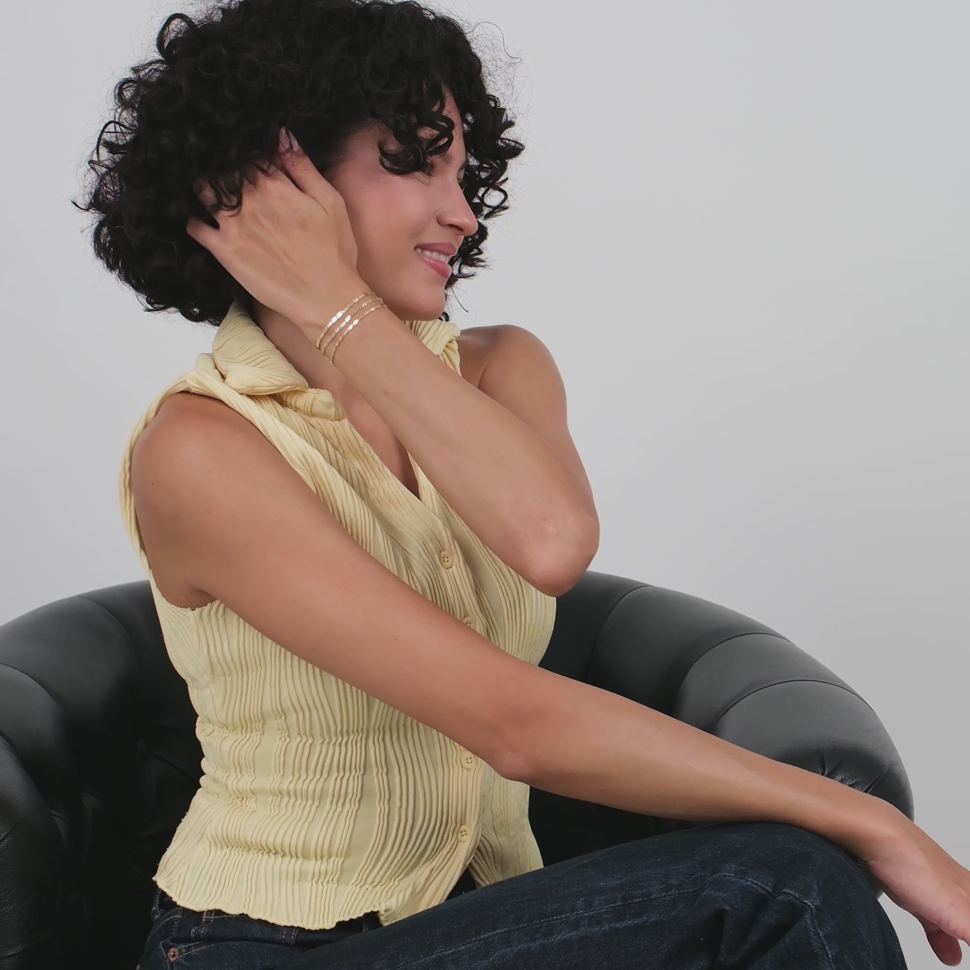 A model with long, flowing hair wearing a 14K gold mirror chain bracelet, adding a touch of sophistication.
