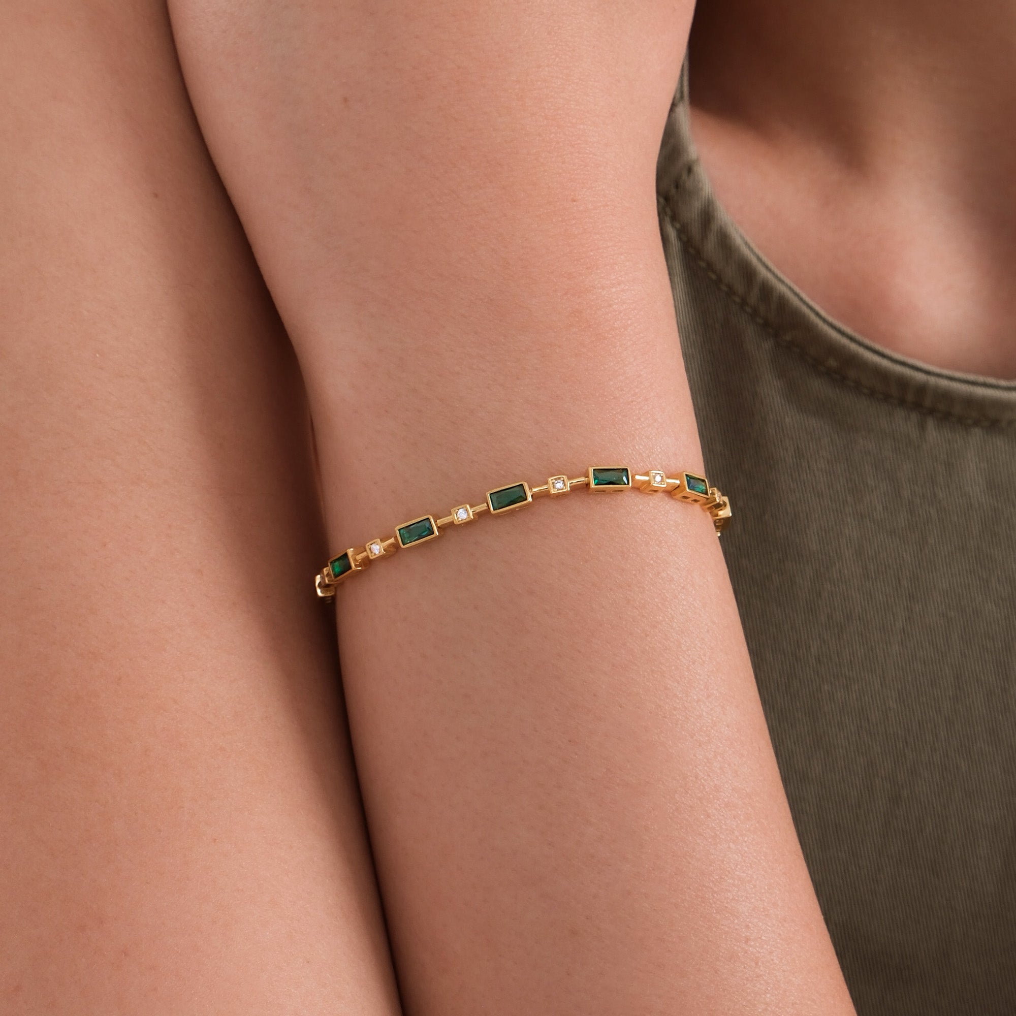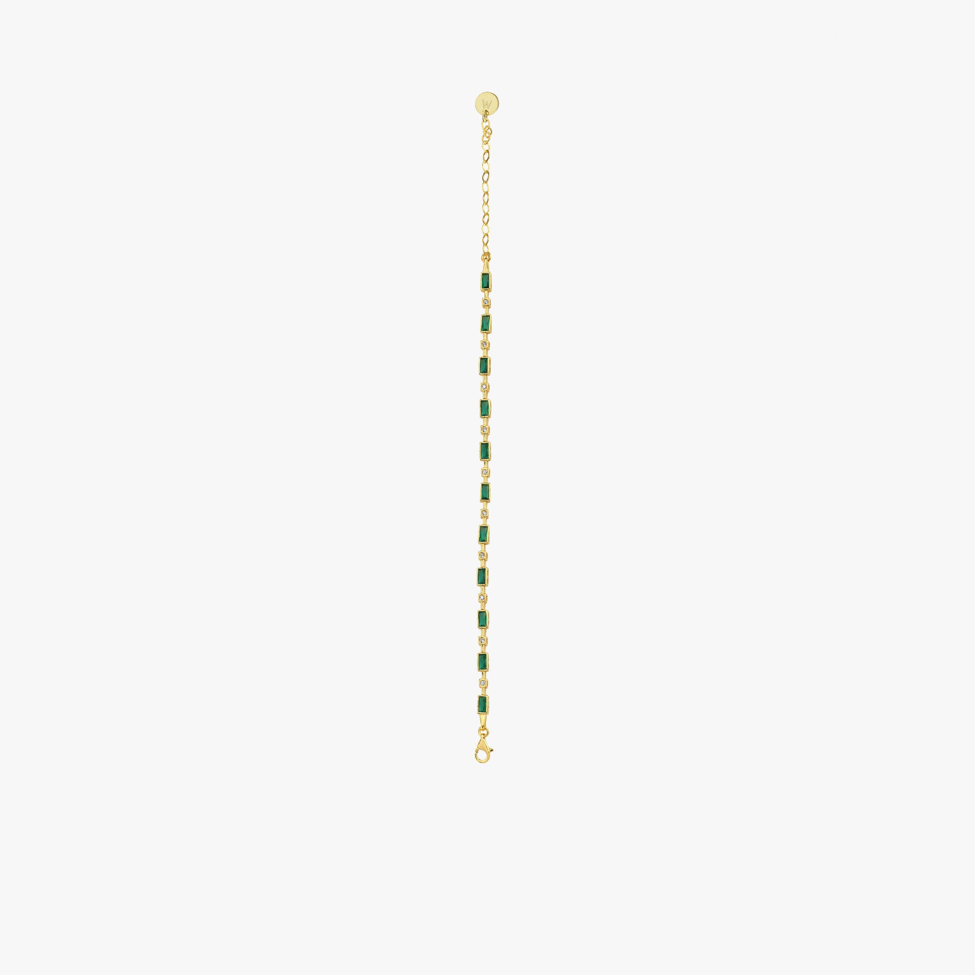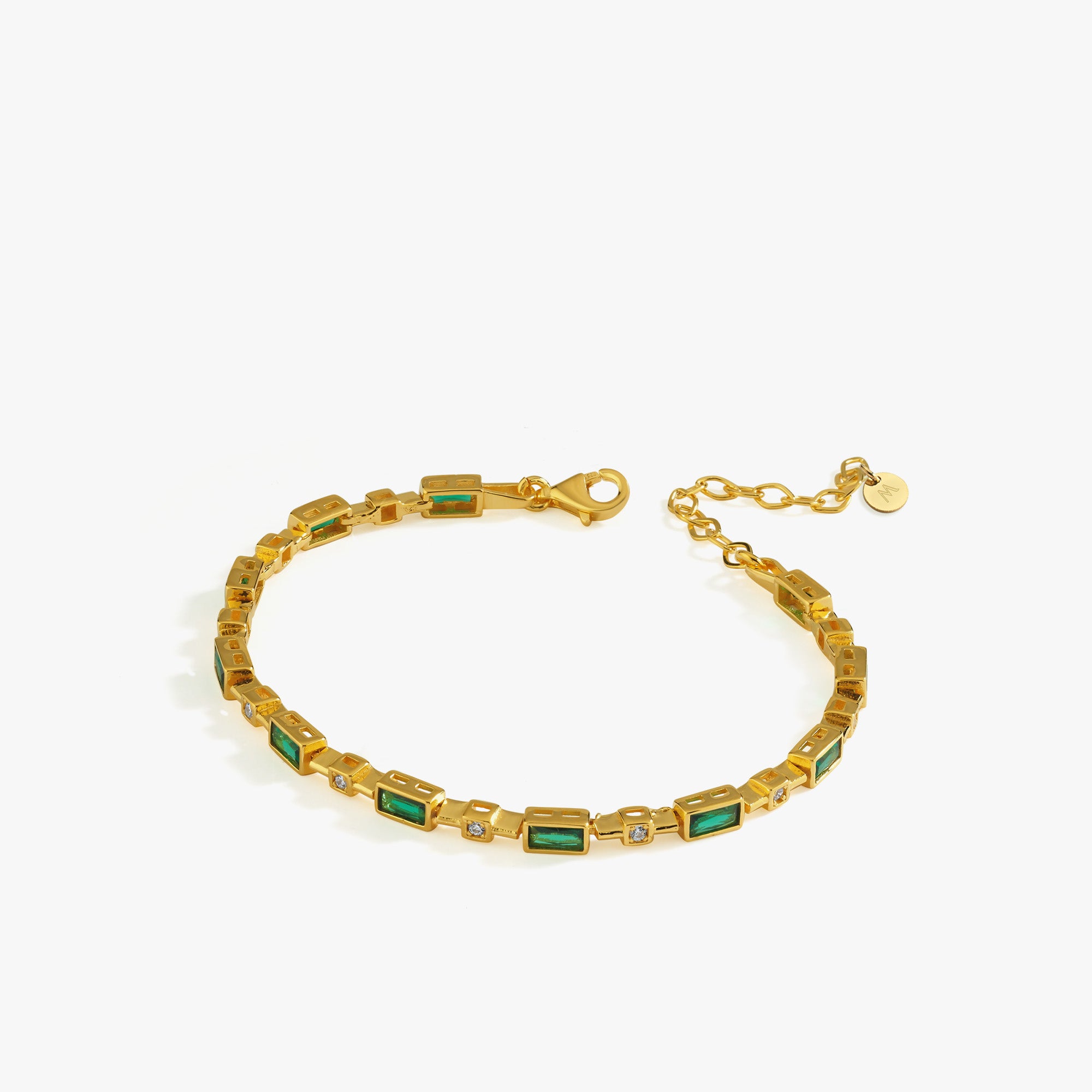 This 18K Gold Vermeil Emerald Tennis Bracelet is a chic and colorful accessory that adds a touch of sophistication to any look. Featuring baguette-cut emerald green stones paired with sparkling accents, it’s a stylish bracelet that works beautifully for both daily wear and special occasions.