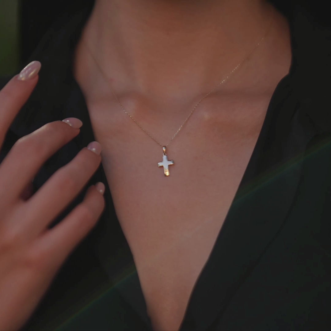 A timeless gold cross necklace, suitable for all ages, featuring a delicate cable chain with a secure spring ring closure. Crafted in your choice of 14K solid gold or gold plated over sterling silver, this classic piece includes a cross pendant measuring 20mm in height and 10mm in width. Perfect for daily wear or as a meaningful gift.