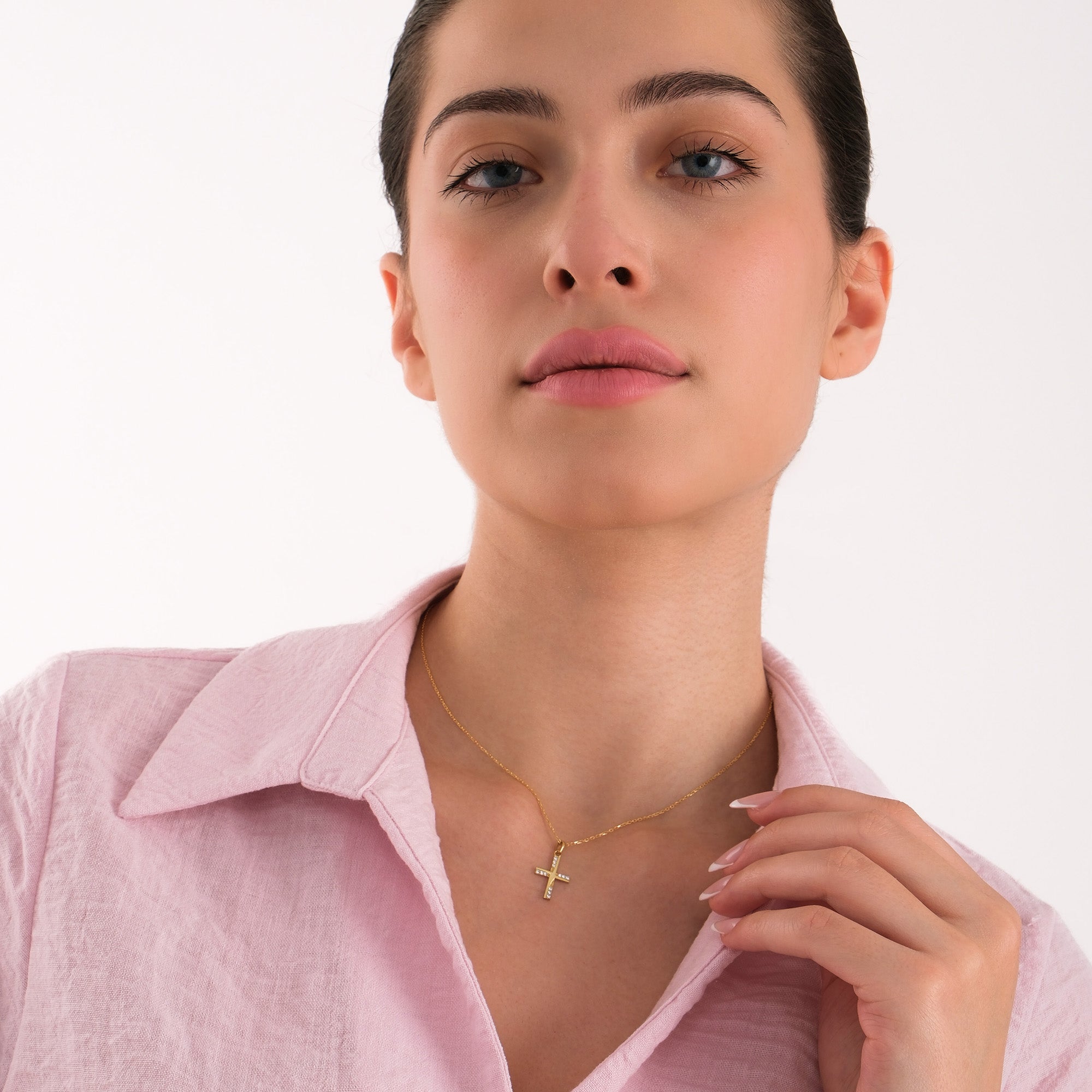 This Dainty Cross Necklace is a timeless and elegant piece, perfect for everyday wear or meaningful gifting. Featuring a classic straight-line cross set with sparkling cubic zirconia stones, it's available in both 14K Solid Gold and 14K Gold Plated. You can choose to purchase the pendant on its own or with the chain.