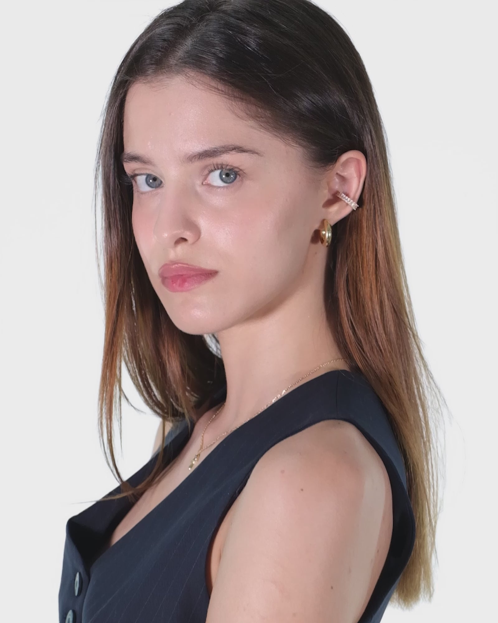 A front view of a woman with light skin and long, brown hair wearing an 18K gold vermeil chunky hoop earring, her arm raised, emphasizing the earring's bold, polished look with her simple black top.