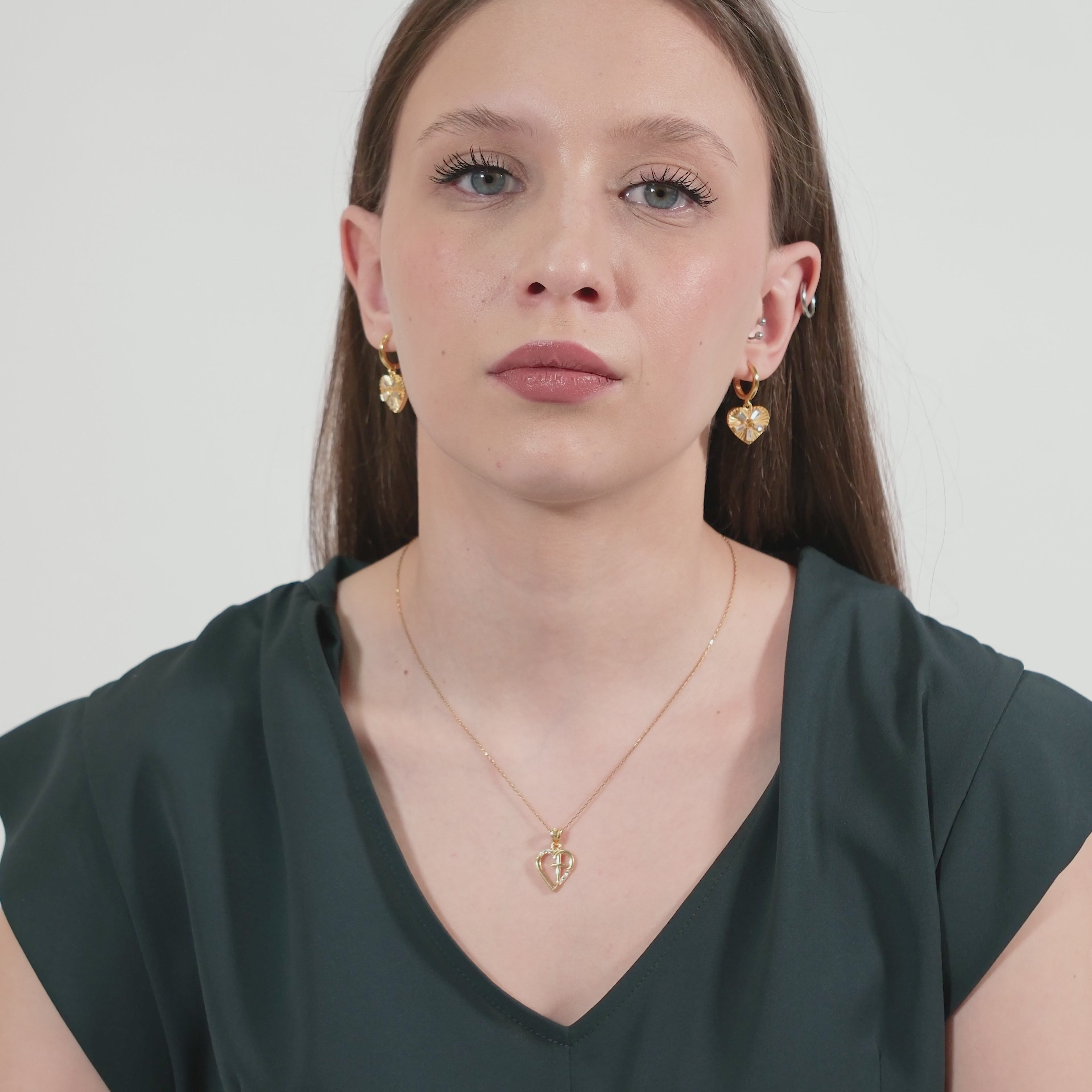 Our 18K Gold Vermeil Heart and Cross Necklace beautifully marries love and faith in a heart-shaped pendant featuring a cross adorned with sparkling stones. Crafted over sterling silver and measuring 15mm in length, this elegant piece hangs from a delicate chain and serves as a powerful symbol of devotion. Perfect as a heartfelt gift or a meaningful personal keepsake.
