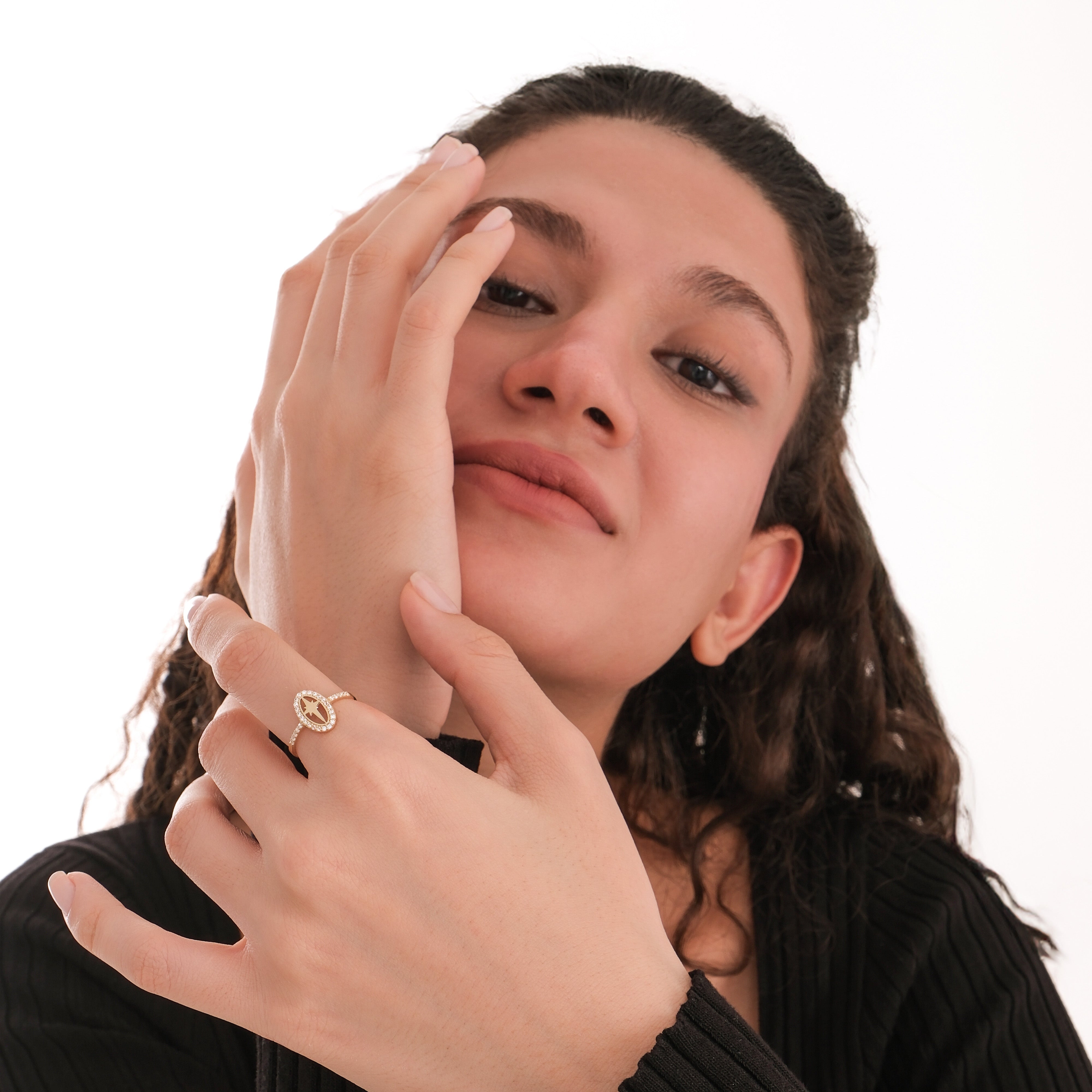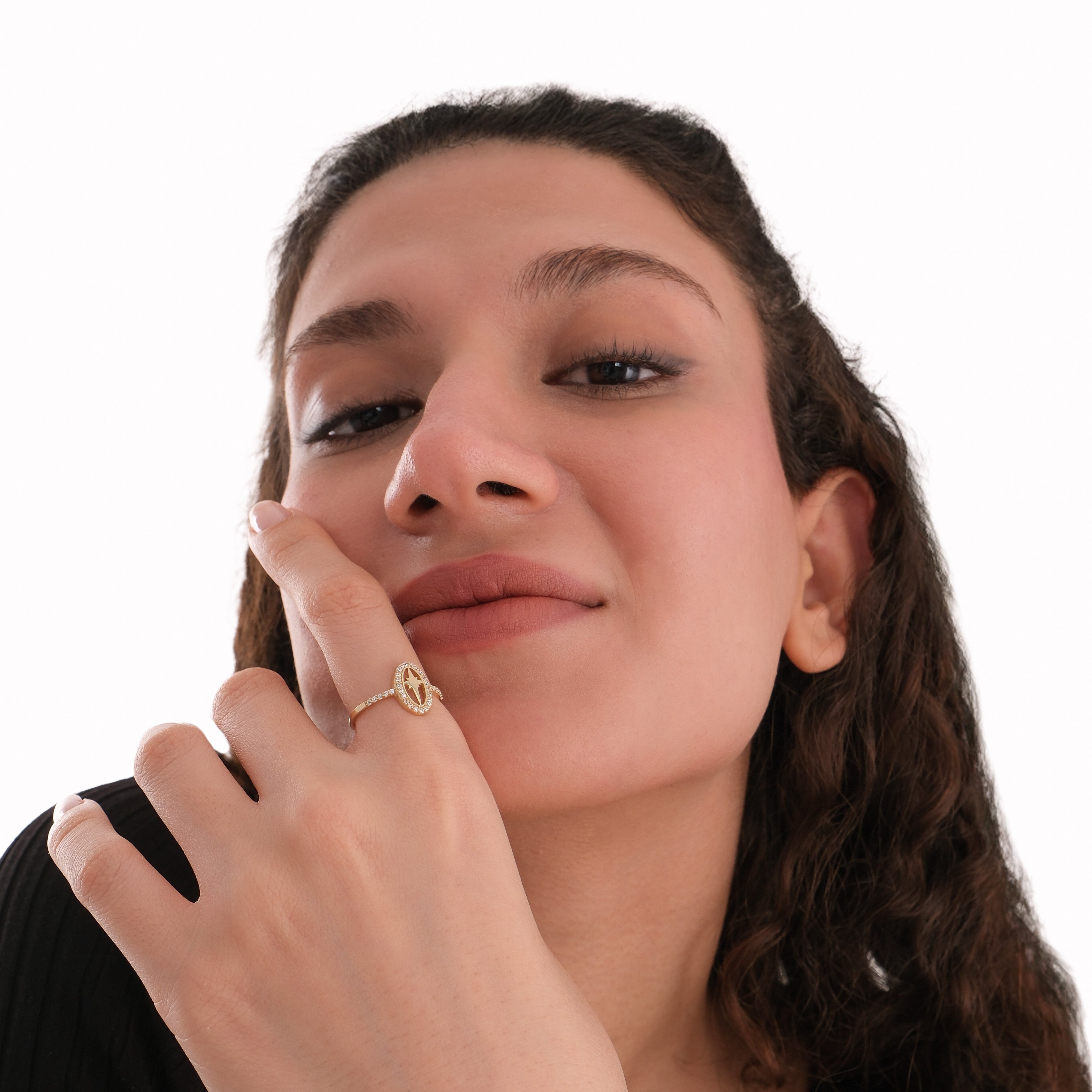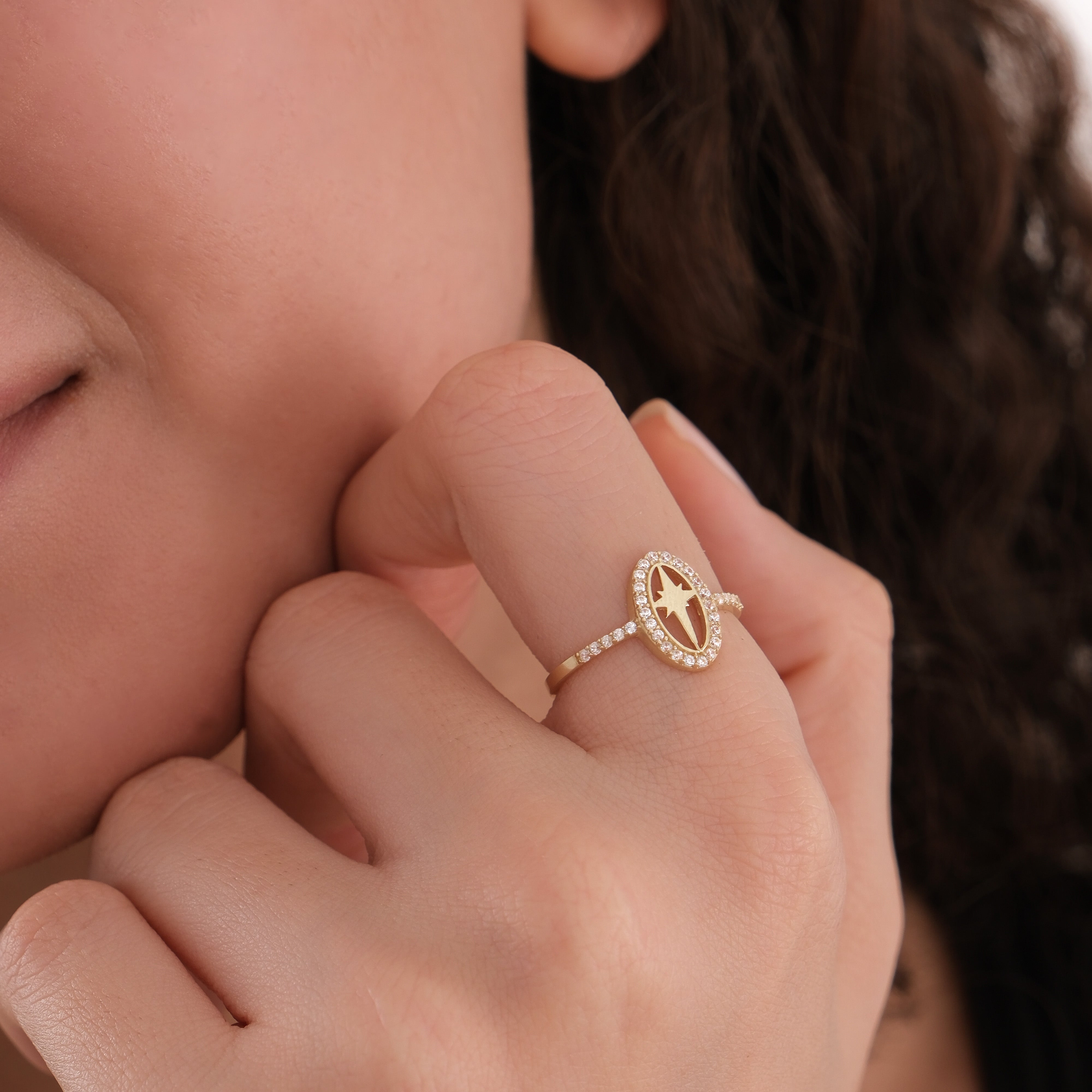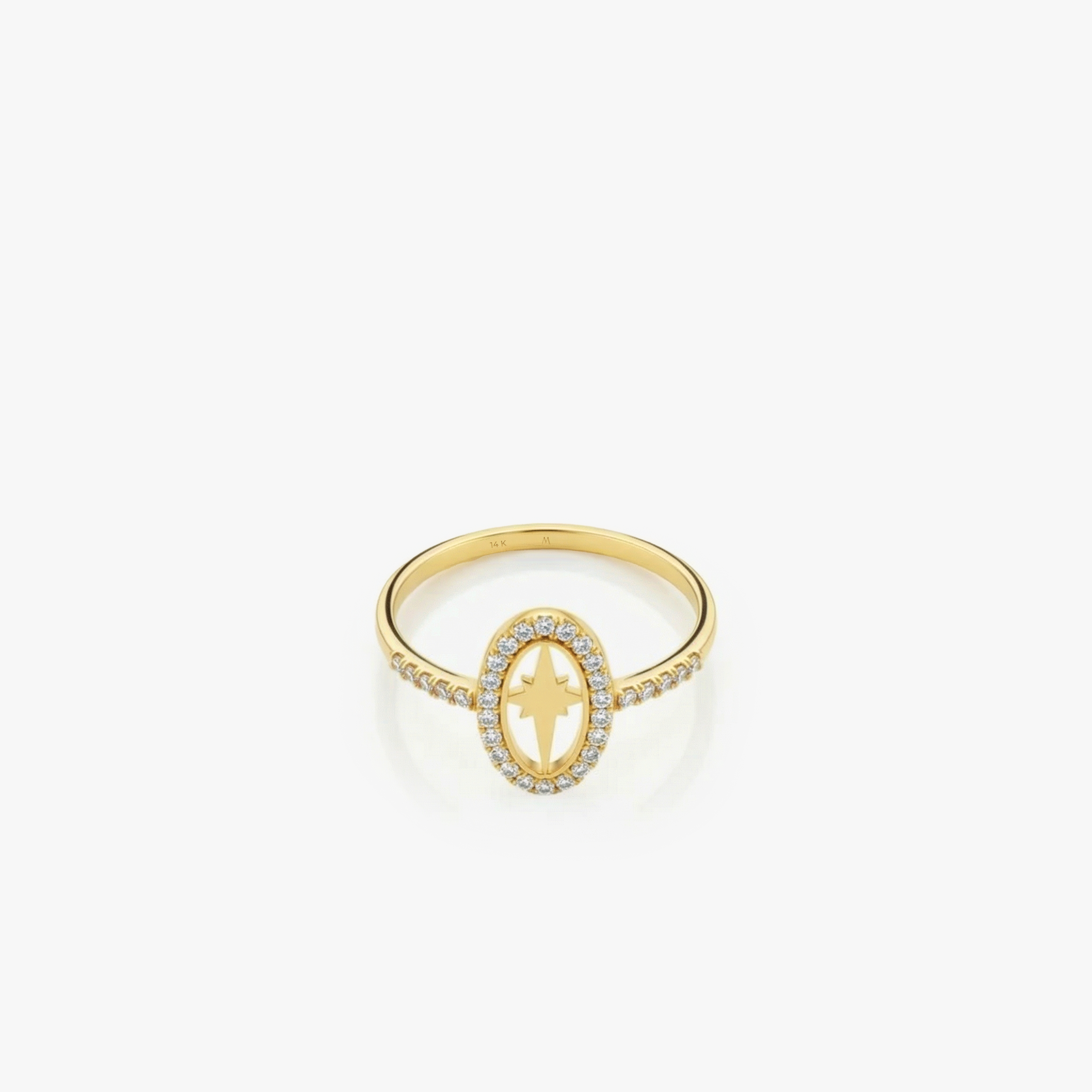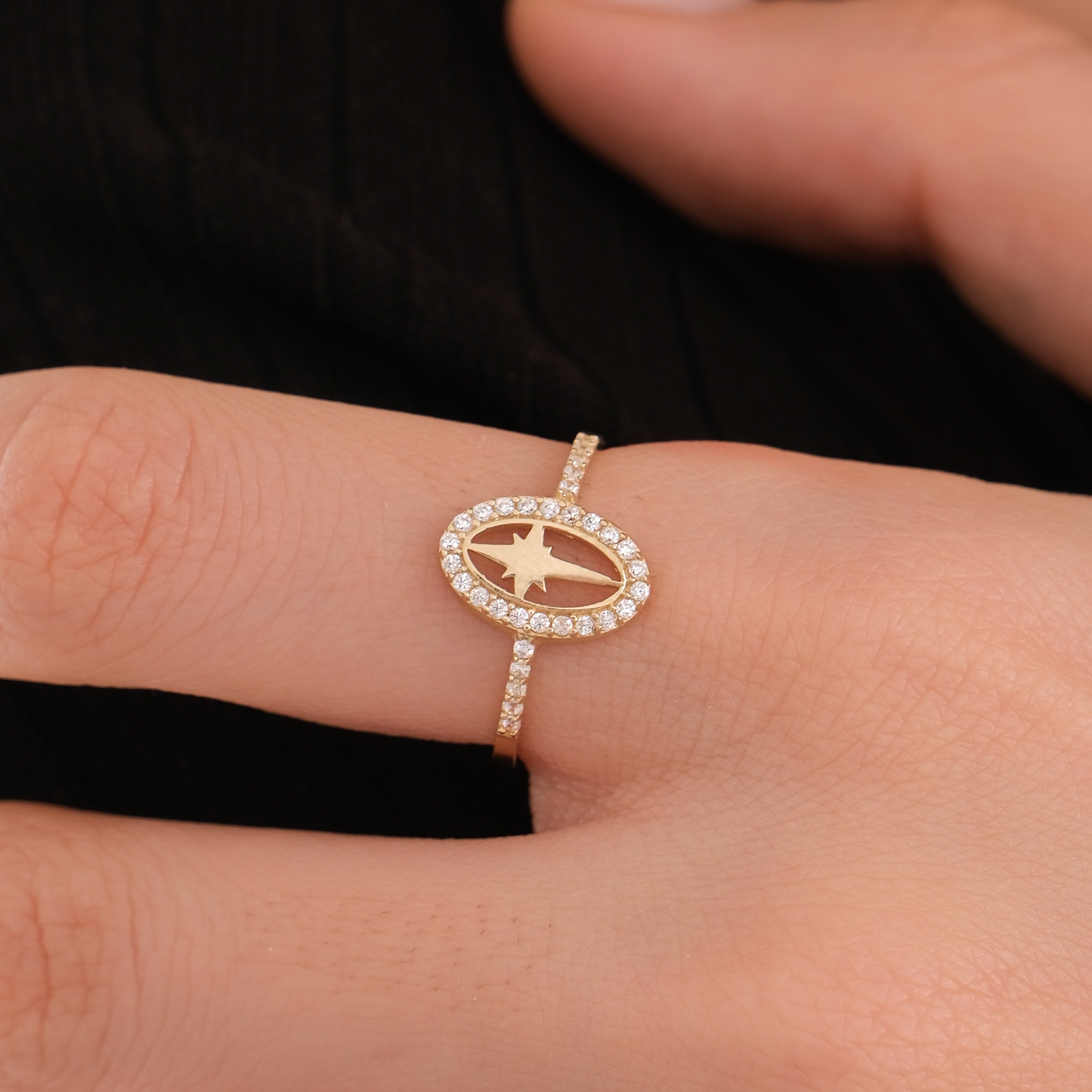 This oval star ring is crafted from 14K solid gold and features an elegant star design within an oval frame surrounded by sparkling cubic zirconia stones. A timeless and celestial piece that adds brilliance to any style — perfect as a Christmas gift.