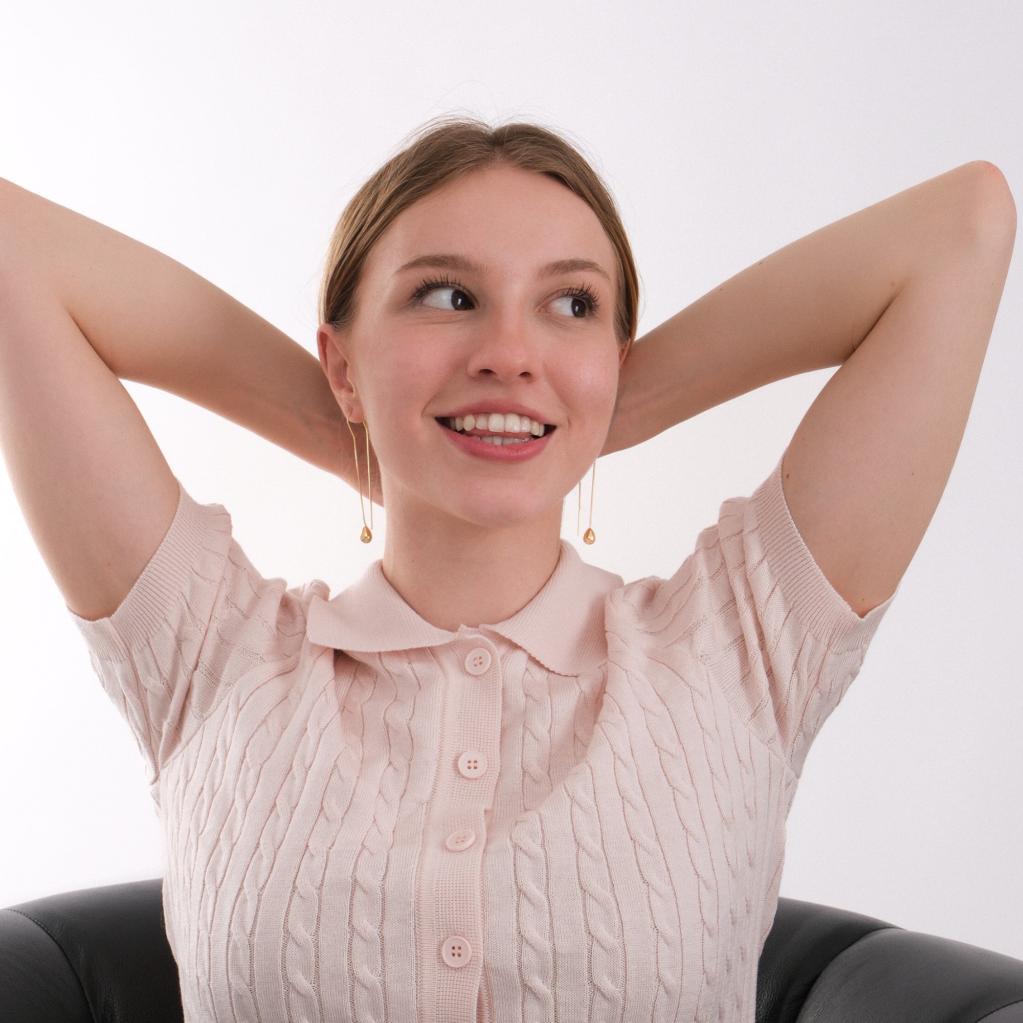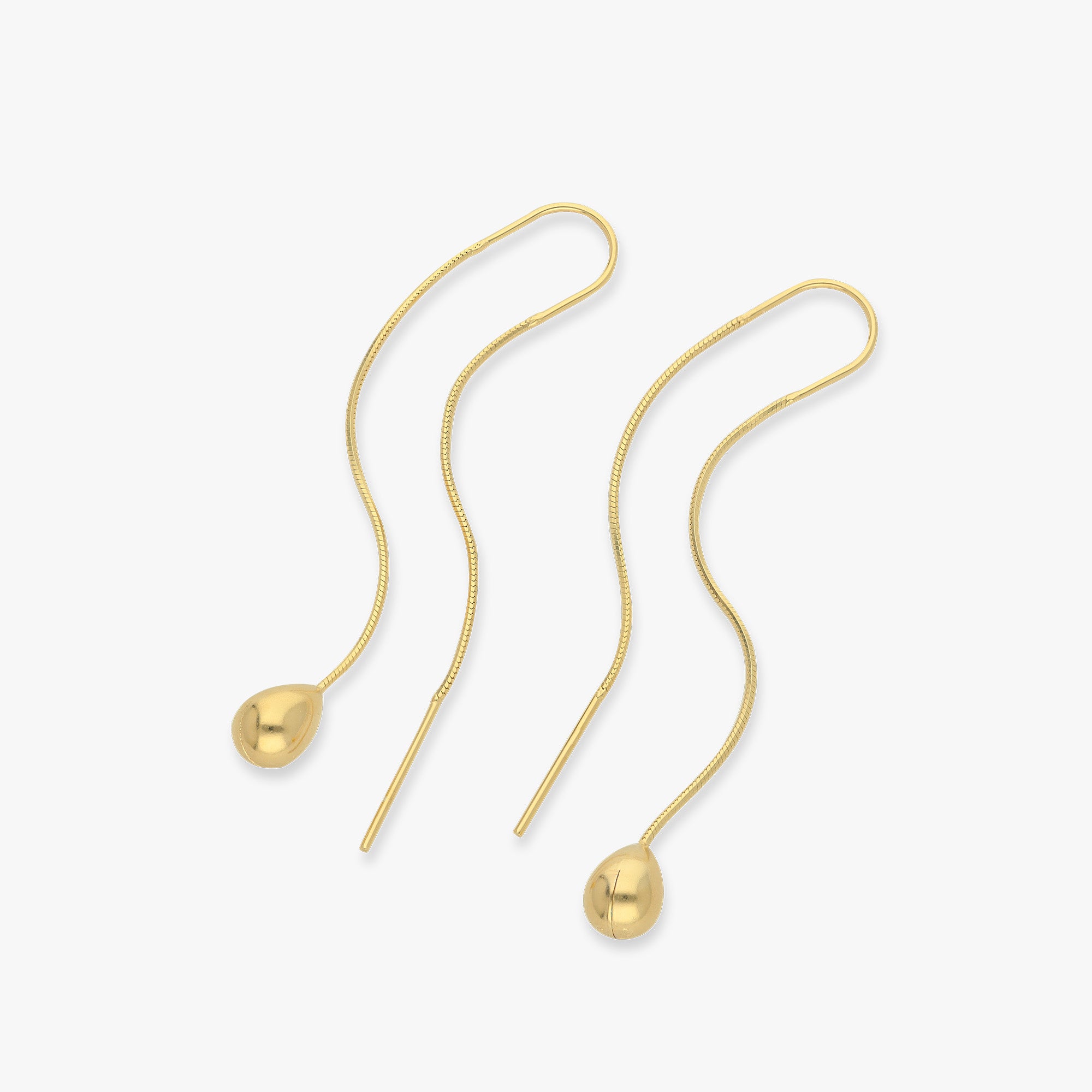 These 18K gold vermeil teardrop threader earrings bring refined elegance to any look. Crafted with a long, delicate chain and a smooth teardrop drop, they're designed for effortless wear—whether for a wedding, everyday styling, or layering with your favorite pieces. Handcrafted by experienced artisans, they're made to order and arrive beautifully packaged. A piece you'll reach for again and again.