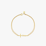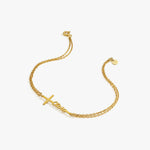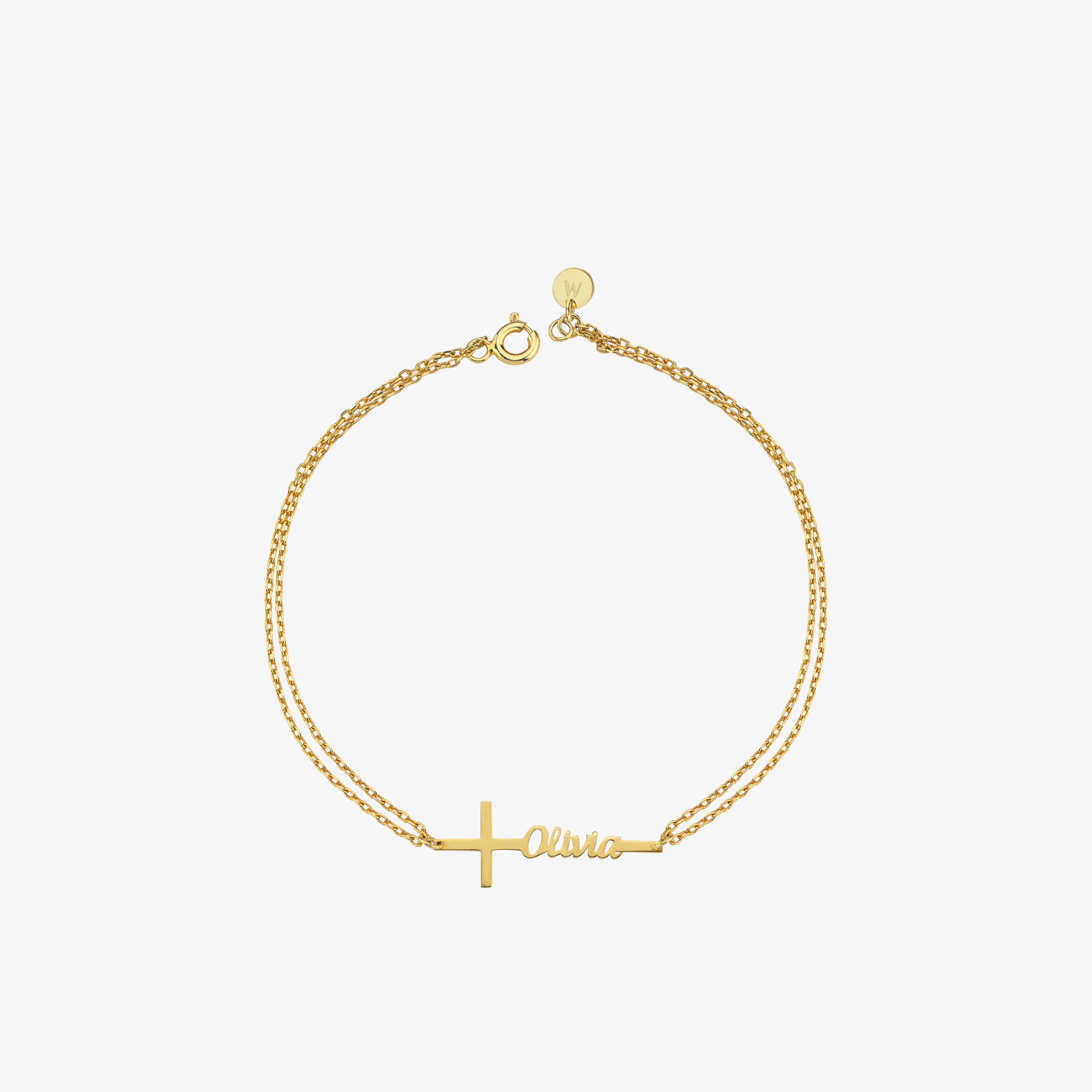 This bracelet is available in two material options: 14K solid gold and 14K gold plated. Suitable for both adults and babies. A great choice for baptisms or as a personalized gift, featuring a custom name and a sideways cross charm.