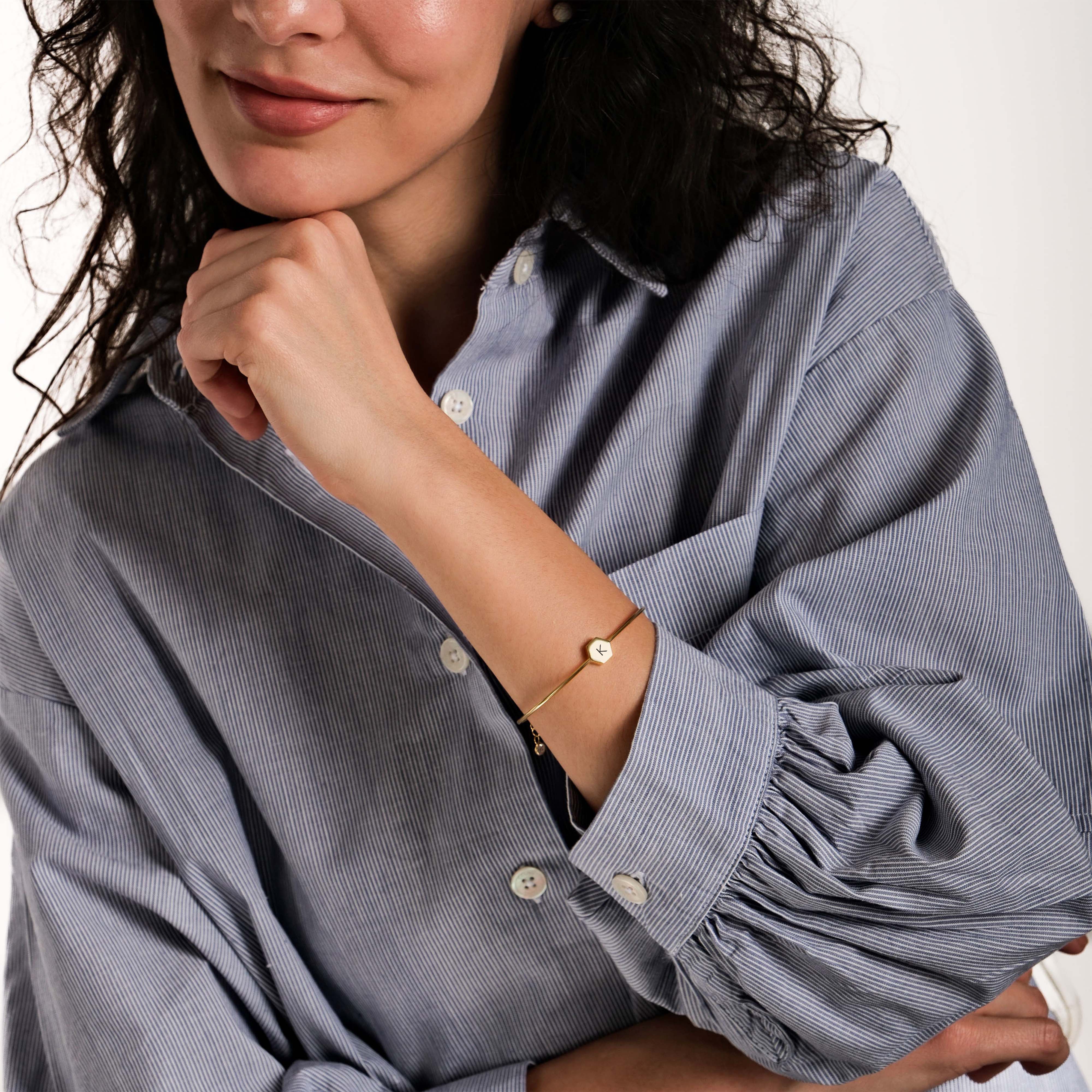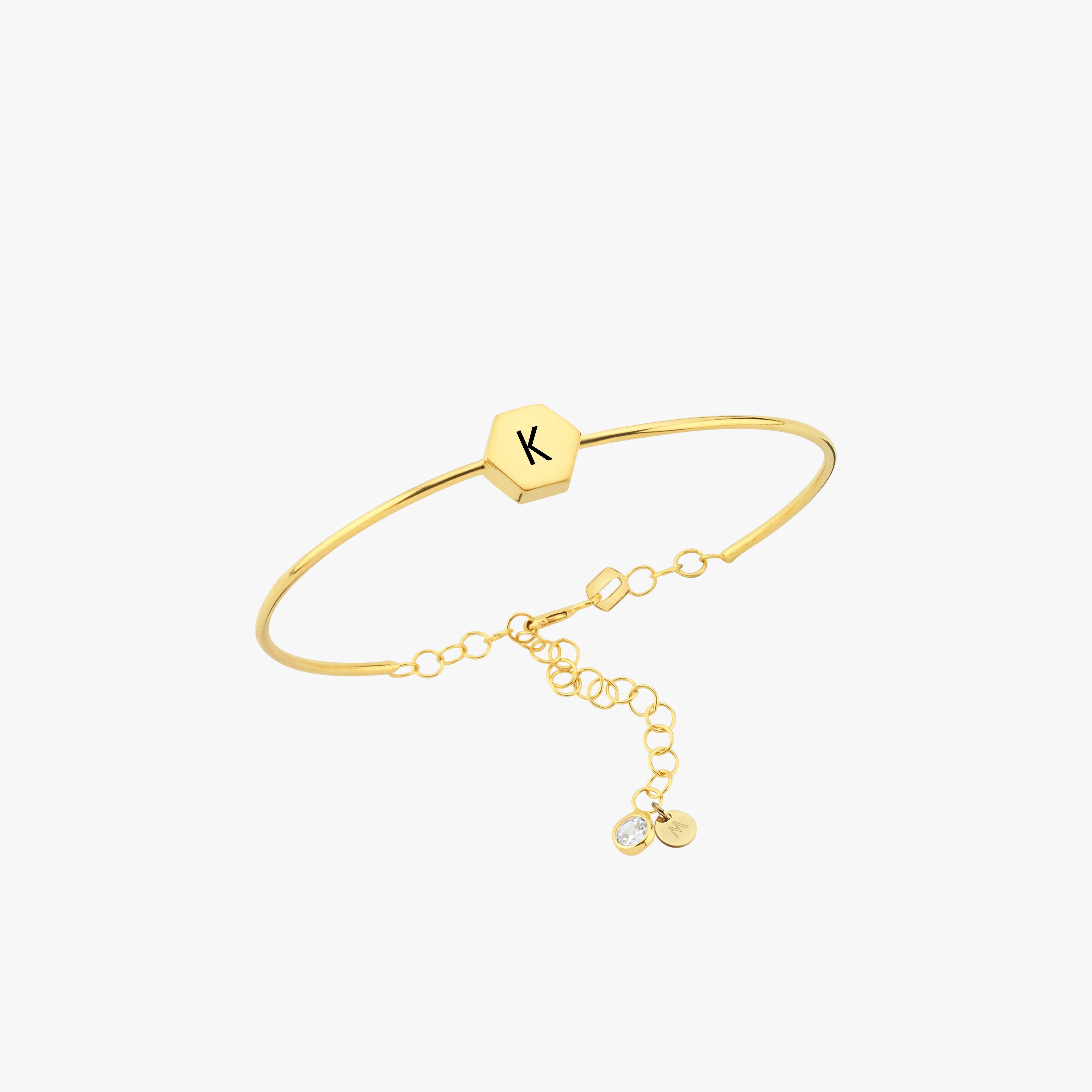 Carry your story with style in our Personalized Initial Bangle, crafted in sterling silver. This sleek, modern bracelet features a 0.25-inch hexagon charm engraved with your chosen initial, making it a meaningful piece for everyday wear or a thoughtful gift for someone special.