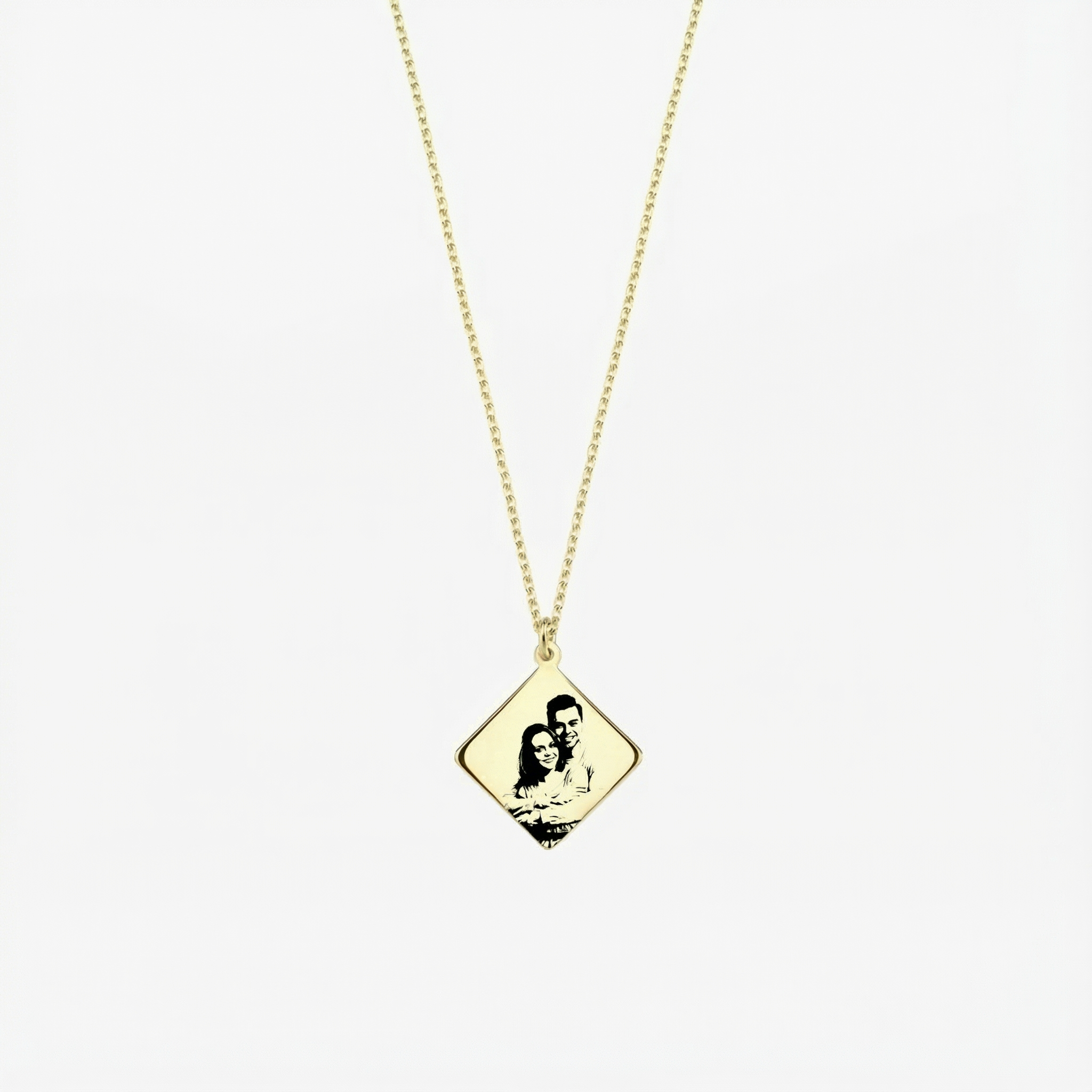 Turn your favorite memory into a timeless piece with our Custom Portrait Necklace. Featuring your personal photo engraved on a diamond-shaped pendant, this meaningful necklace is available in two premium finishes: solid 14K gold for a luxurious heirloom-quality gift, or 14K gold plated over 925 sterling silver for a beautiful and affordable option. A unique keepsake for anniversaries, birthdays, or any special moment.