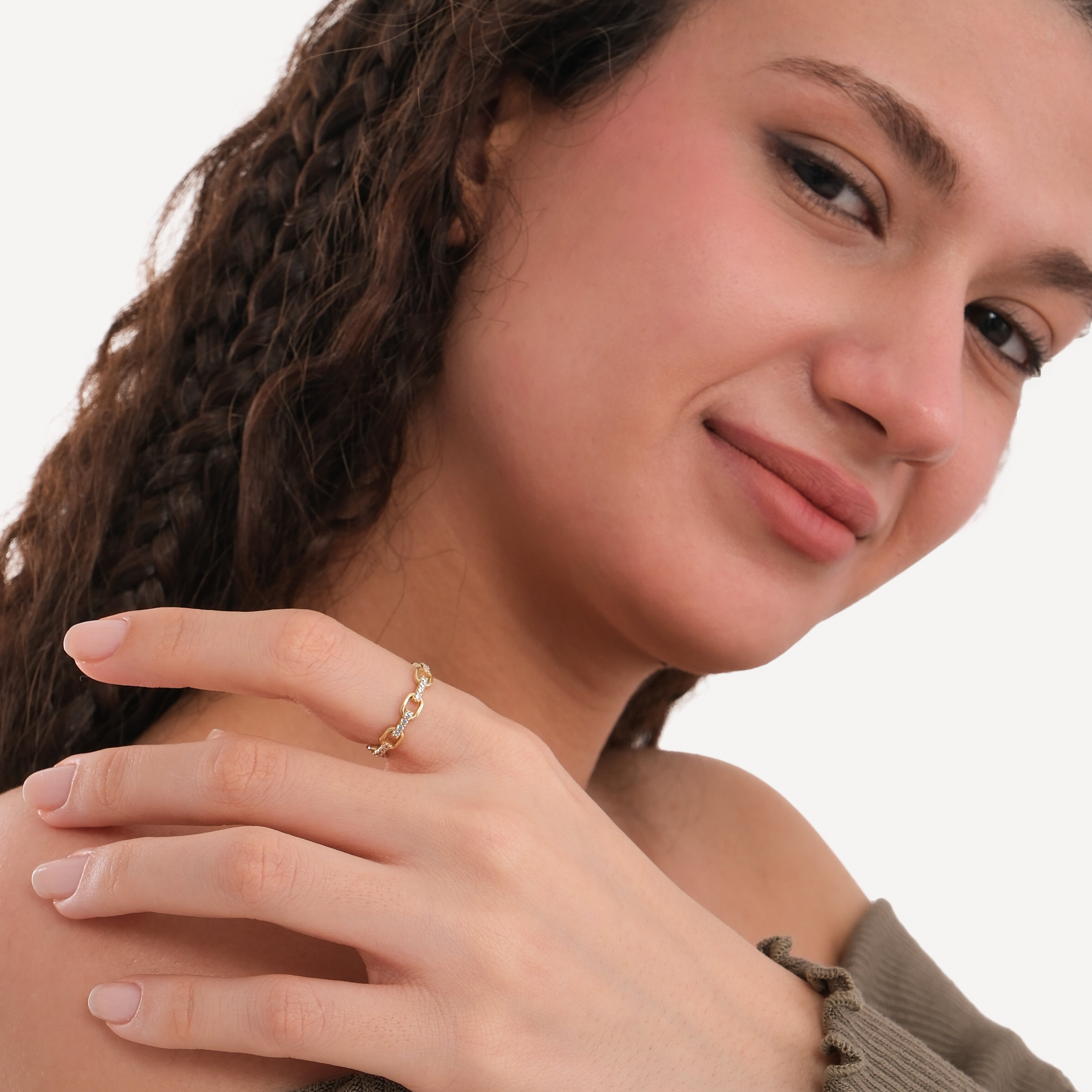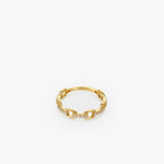The Chain Ring in 14K Solid Gold combines boldness and brilliance in perfect harmony. Featuring interlocking gold links partially encrusted with shimmering stones, this ring exudes modern sophistication and timeless appeal. Ideal for stacking or wearing solo, it’s a standout piece that adds a chic statement to any outfit.