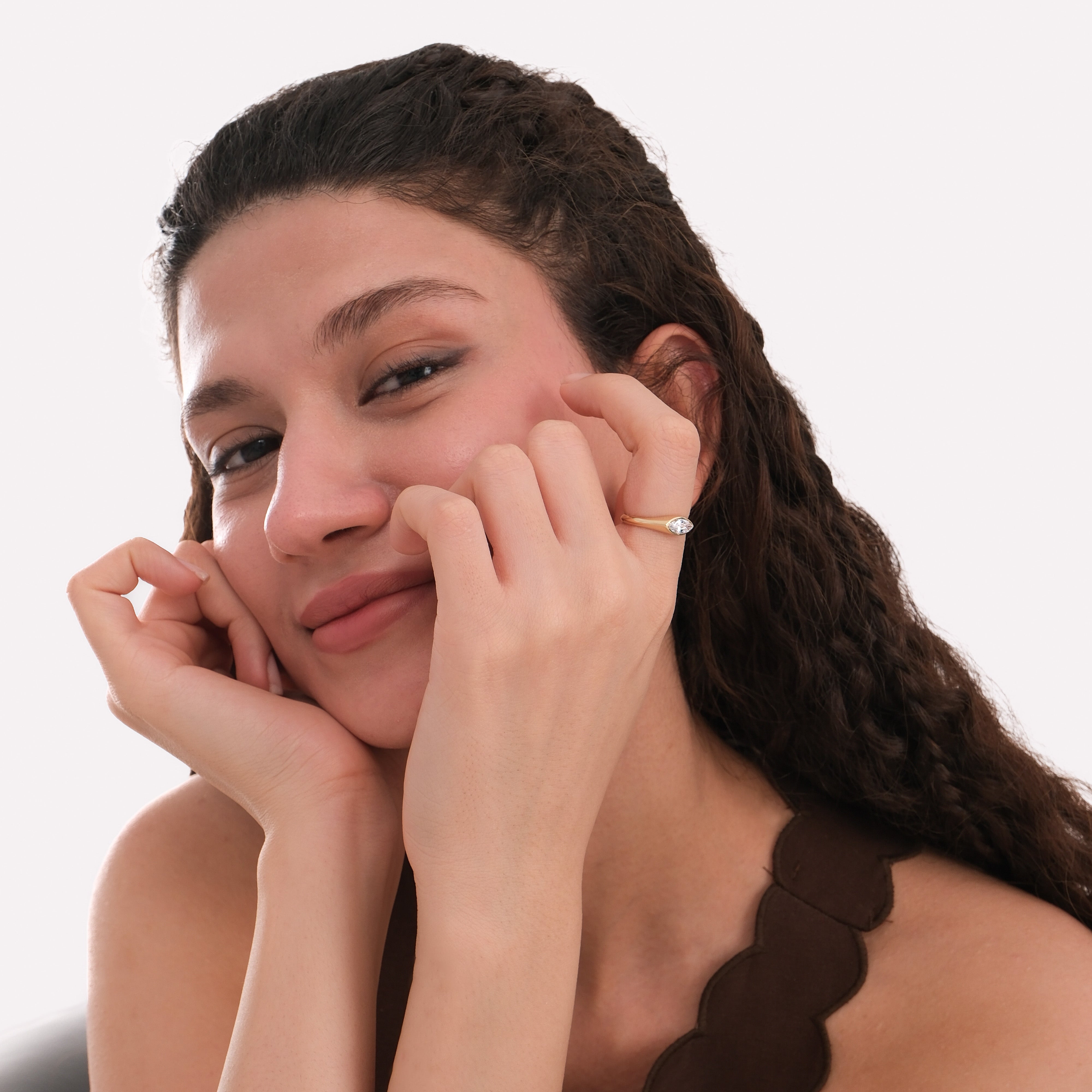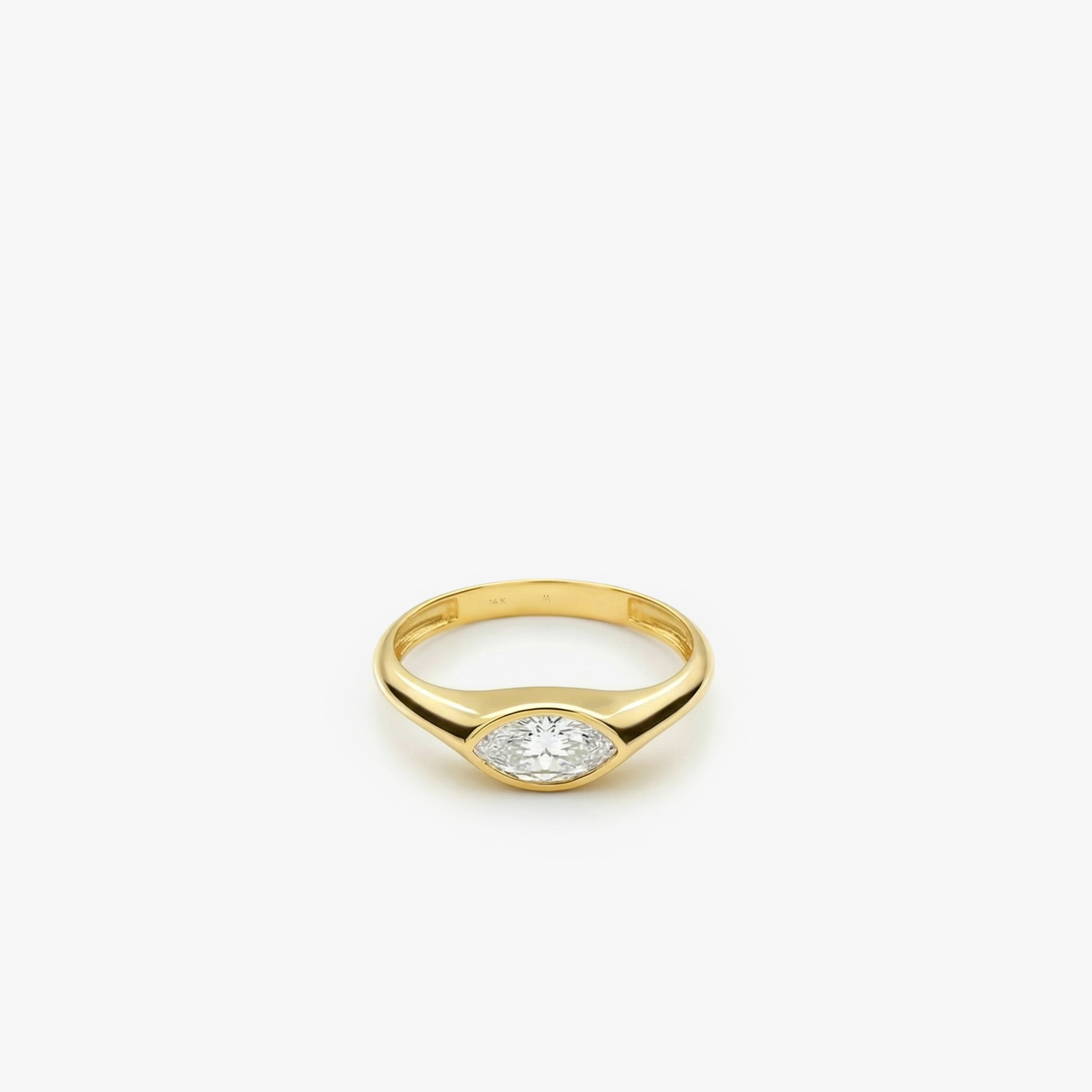 The East-West Ring in 14K Solid Gold redefines timeless elegance with a bold twist. Featuring a horizontally set marquise-cut stone, this ring offers a sleek, modern aesthetic that captures light beautifully from every angle. Its smooth, rounded band provides a comfortable fit β perfect for daily wear or as a unique engagement statement.