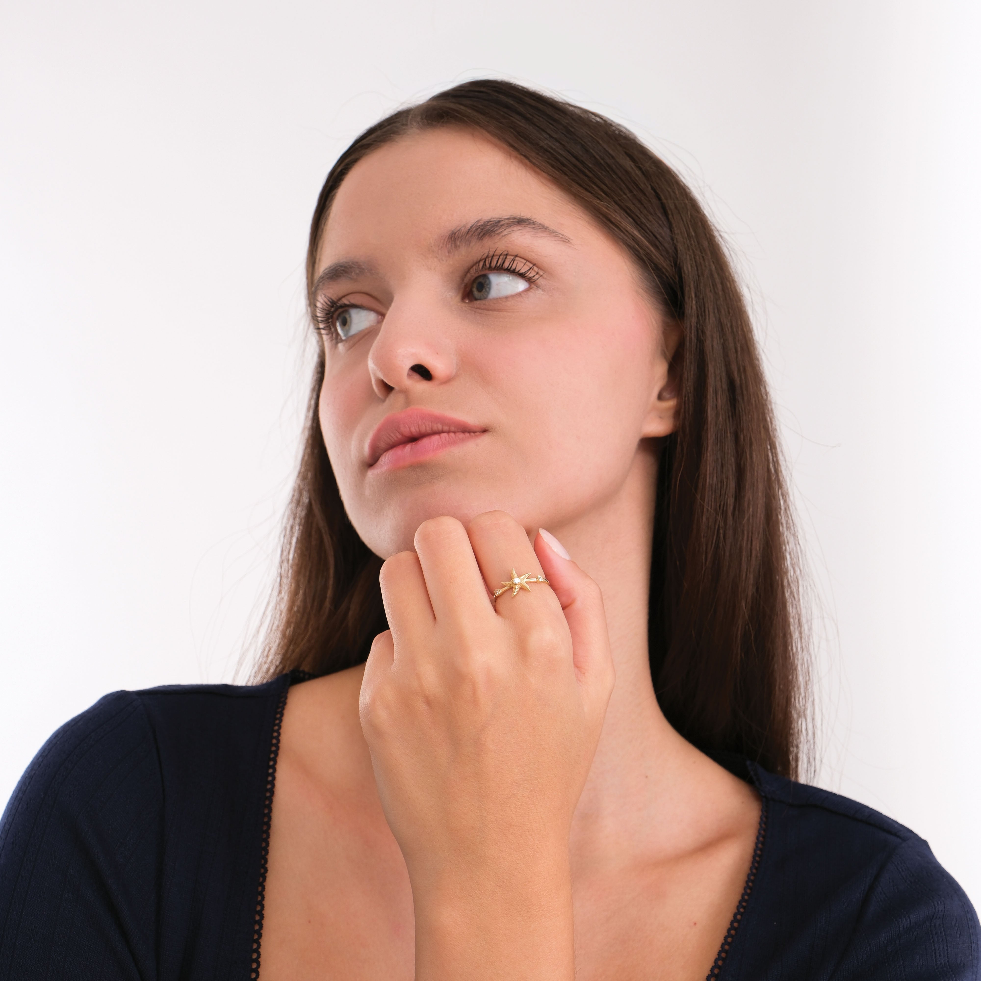 The Starfish Ring in 14K Solid Gold is a celebration of the sea and its timeless beauty. Featuring a delicately detailed starfish with sparkling cubic zirconia accents, this design captures the magic of ocean life. Perfect for those who love the sea or want to carry a hint of summer elegance every day.