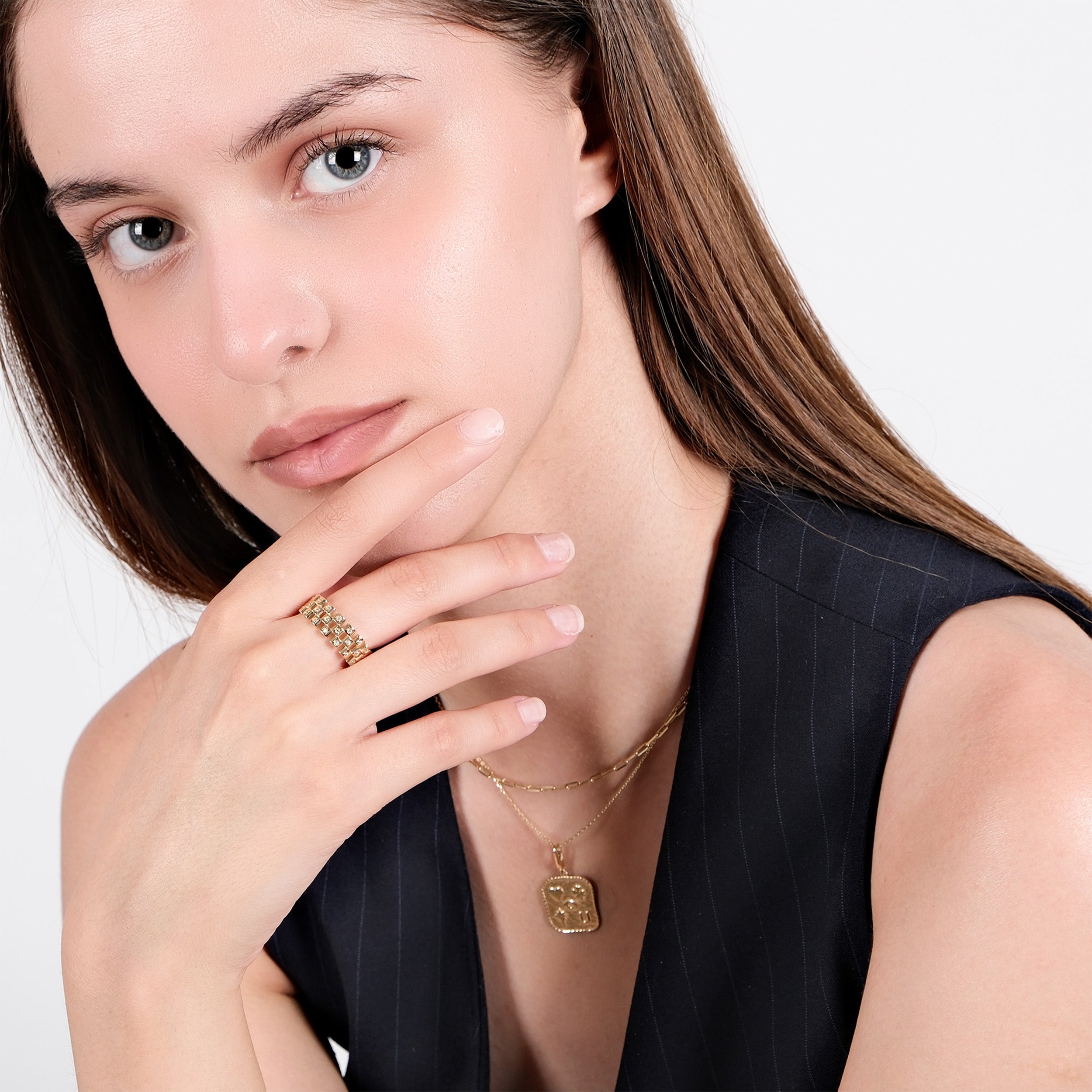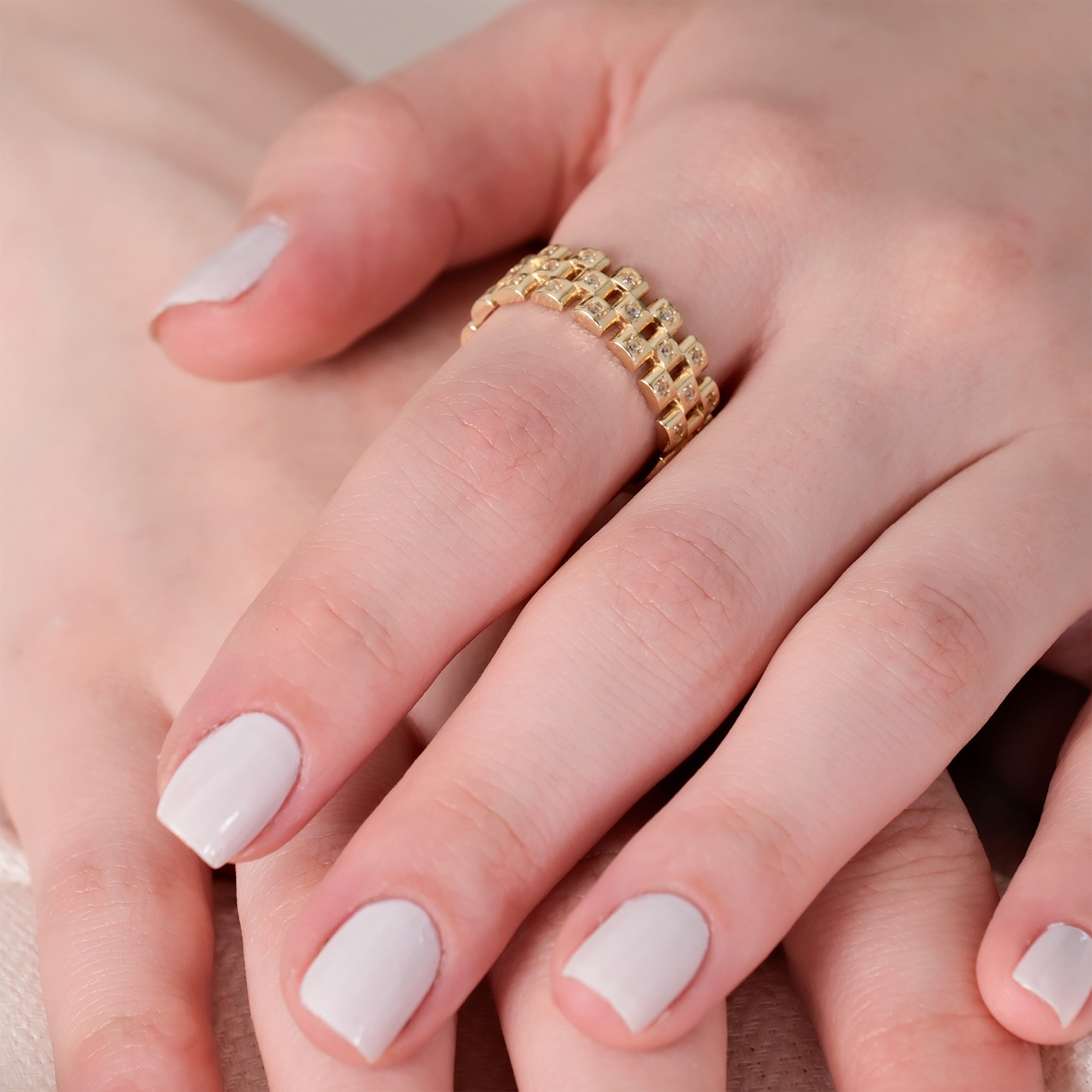 This modern chain ring is crafted from genuine 14K solid gold and accented with brilliant cubic zirconia stones for a refined, eye-catching sparkle. Its bold chain-inspired design delivers a contemporary yet timeless look, making it perfect for both everyday wear and special occasions. Designed for comfort and durability, this solid gold ring is available in multiple size options to ensure an ideal fit. A sophisticated choice for those who appreciate modern gold jewelry with lasting quality.