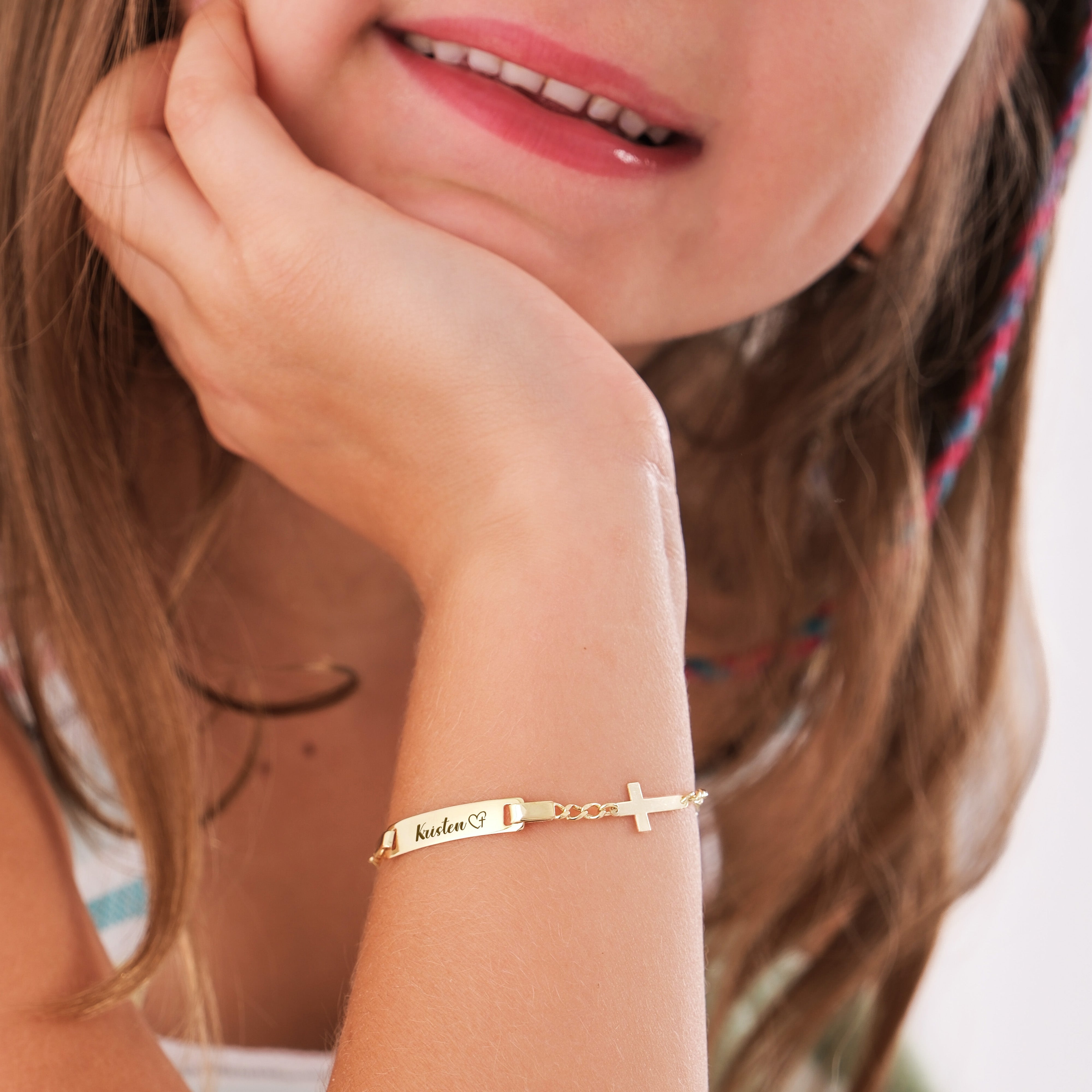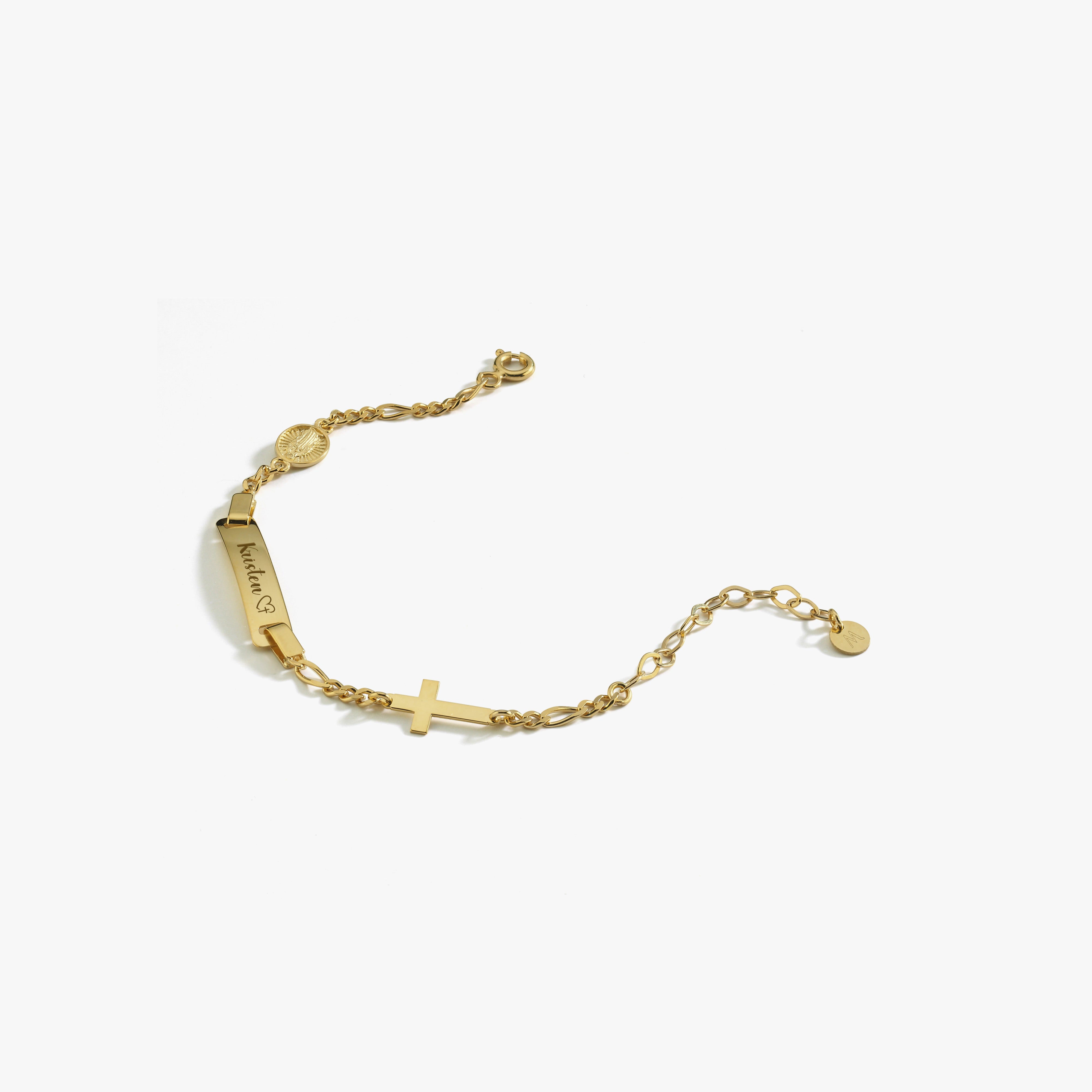 Welcome a new life with our Personalized Baby Cross Bracelet, available in 14K solid gold or gold plated on sterling silver. Featuring a 0.5-inch cross and a 0.25-inch engraved medal, this elegant and meaningful bracelet is designed to commemorate a child's early years with timeless charm. A thoughtful keepsake for baptisms, birthdays, or baby showers.