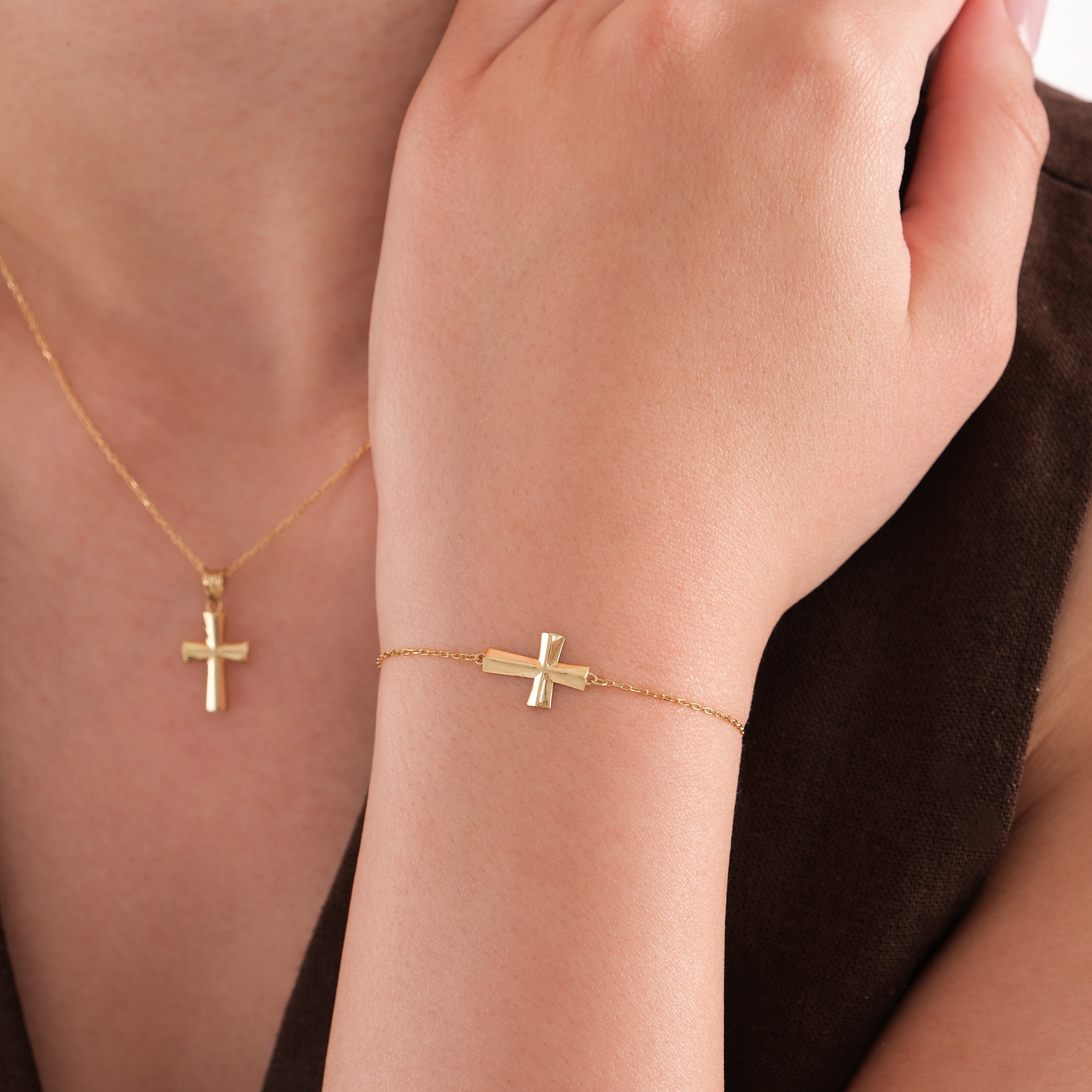 This 14K Gold Plated or 14K Solid Gold Small Cross Bracelet is a minimalist piece with a meaningful touch. Featuring a polished horizontal cross on a delicate chain, it’s designed for everyday wear and timeless faith. A thoughtful gift for her, perfect for layering or wearing solo.