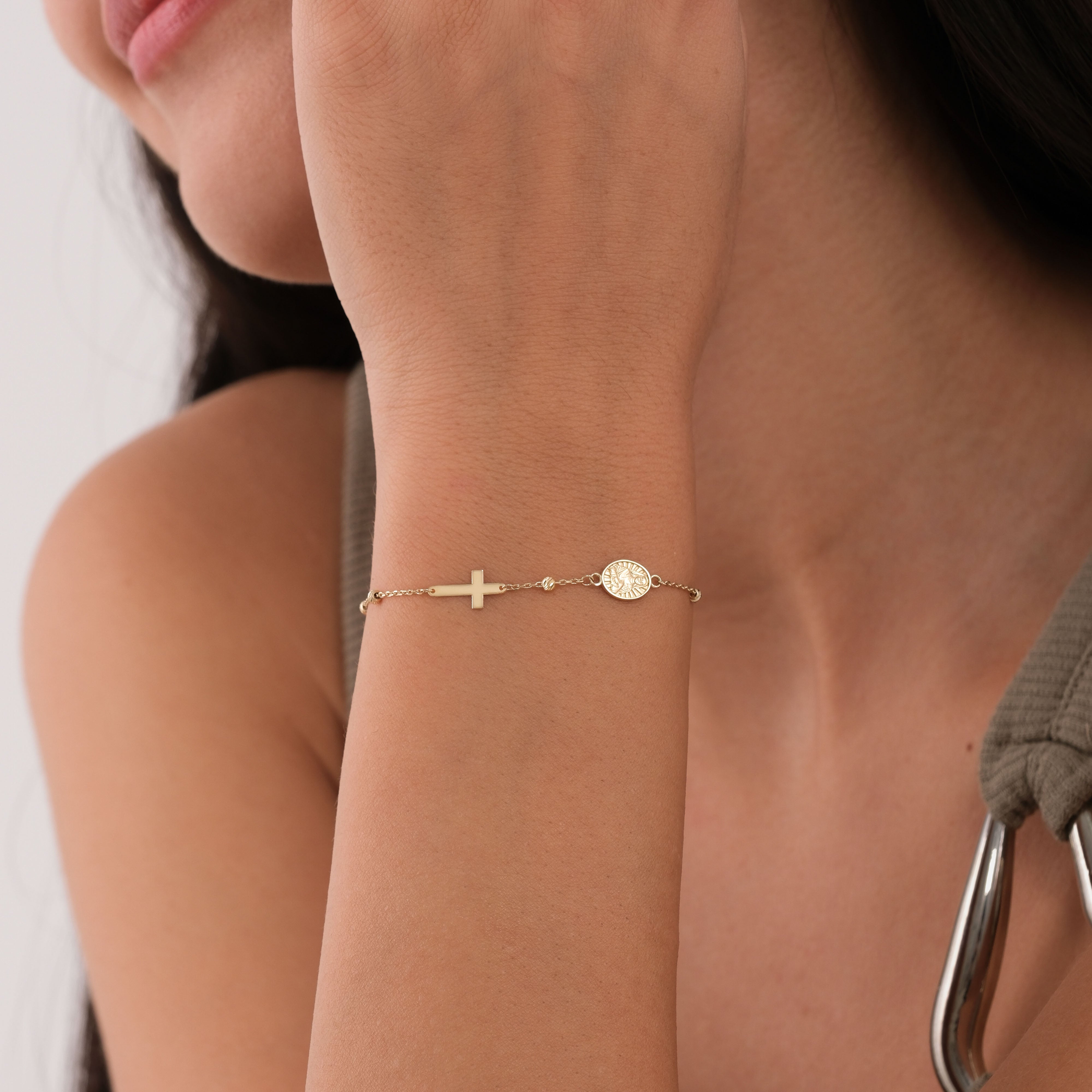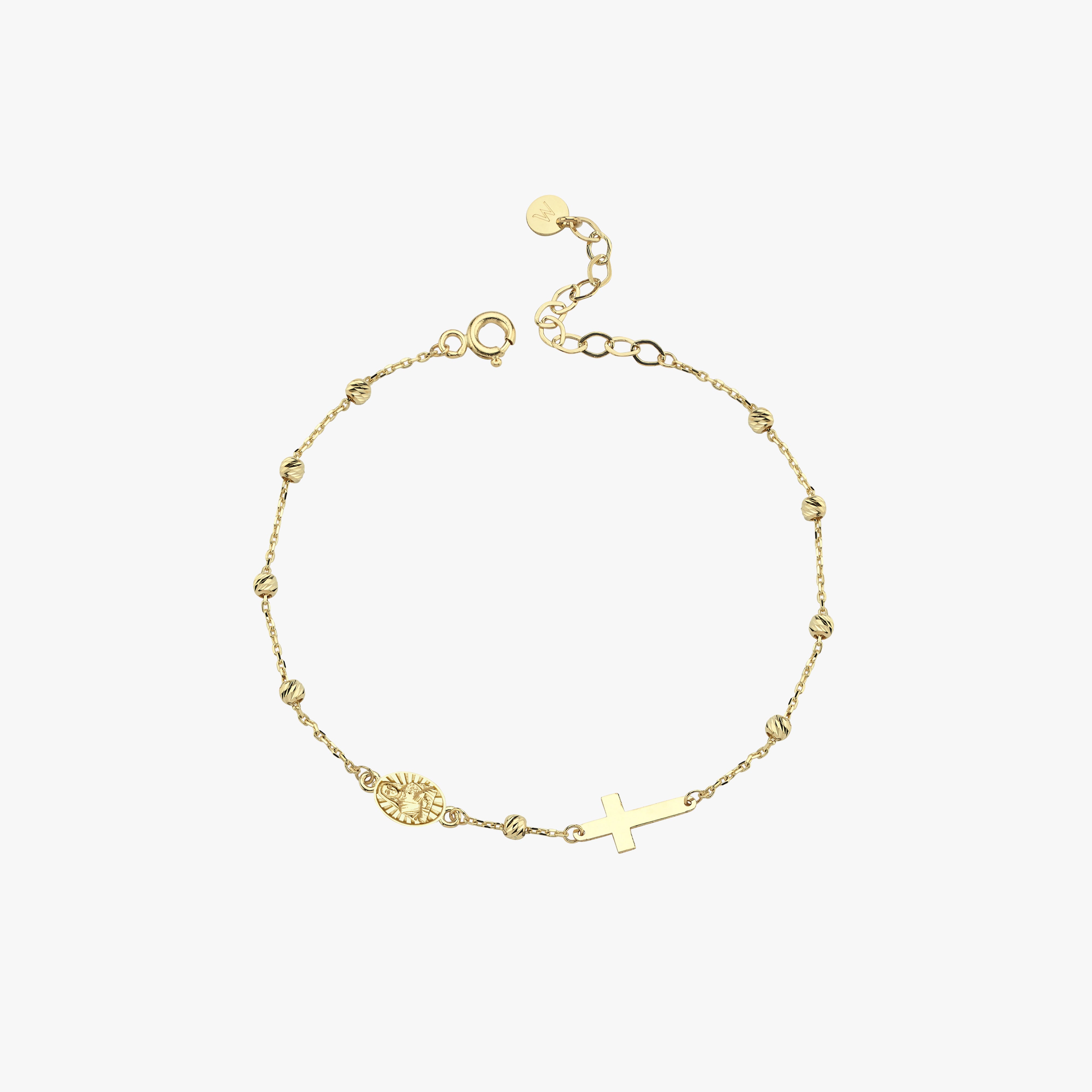 This 14K solid gold St. Therese Catholic bracelet showcases a beautifully detailed medal paired with a minimalist cross, offering a delicate yet powerful symbol of faith. Designed for everyday elegance or heartfelt gifting, it features an adjustable chain for the perfect fit. A timeless piece inspired by the “Little Flower” of Jesus, embodying devotion and grace.