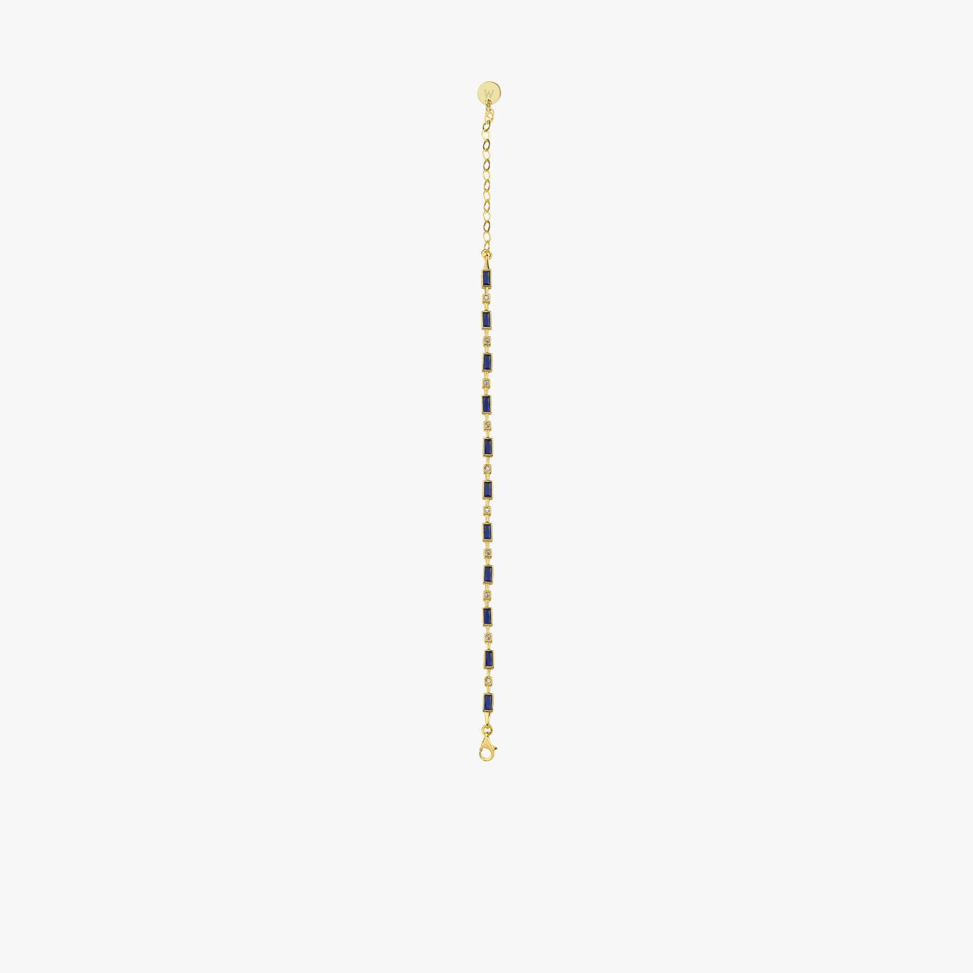 This 18K Gold Vermeil Baguette Sapphire Tennis Bracelet is a refined and elegant piece designed to add a deep touch of color to any outfit. Featuring baguette-cut sapphire blue stones alternated with sparkling clear accents, it brings sophistication and modern style to both casual and formal looks. Perfect as a statement accessory or a meaningful gift.