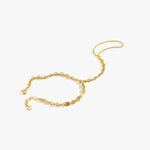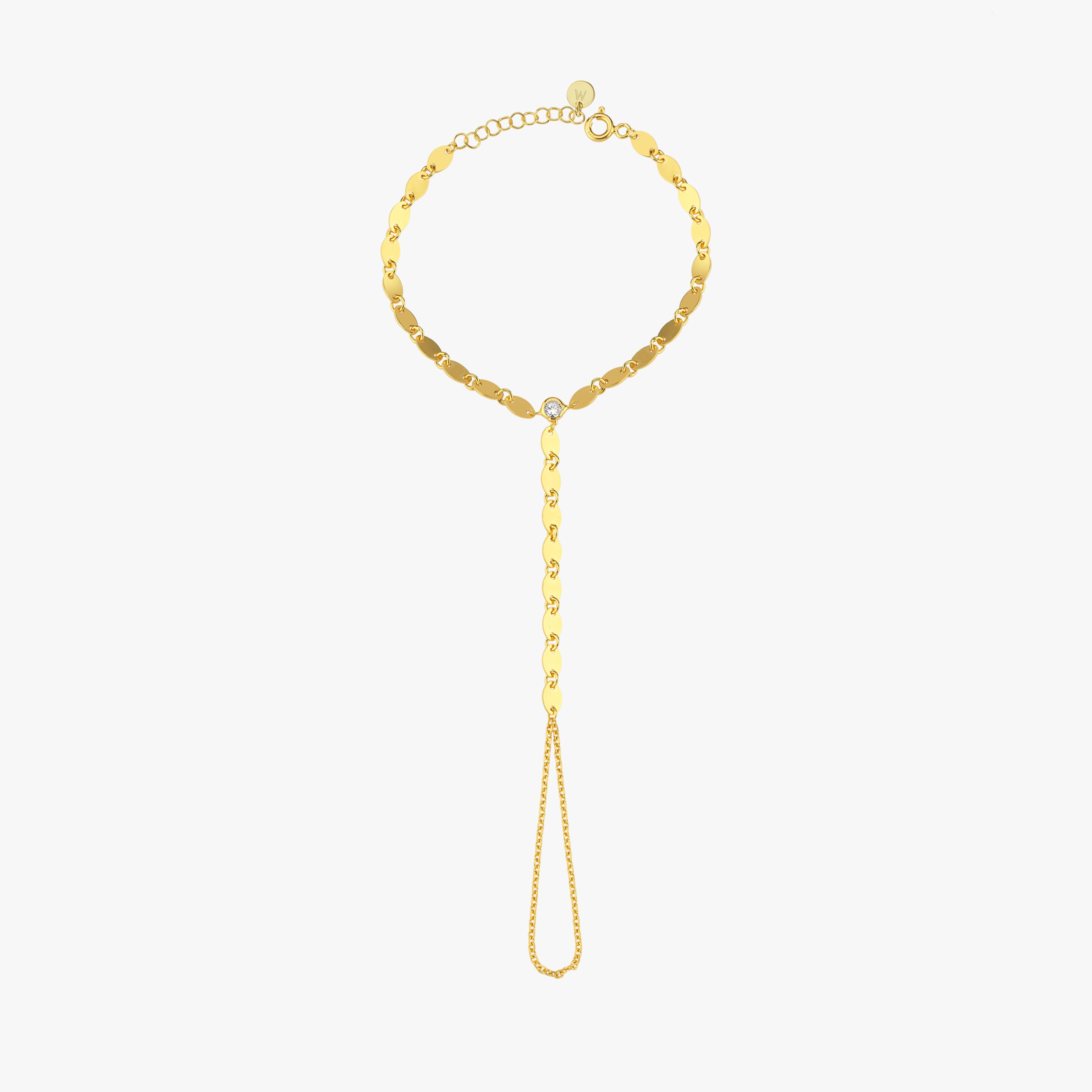 This hand chain is made from 18K Gold Vermeil. The Coi Bracelet blends delicate craftsmanship with a bold statement look. Featuring a sleek chain design and a central gem detail, it adds elegance to both everyday wear and special occasions.