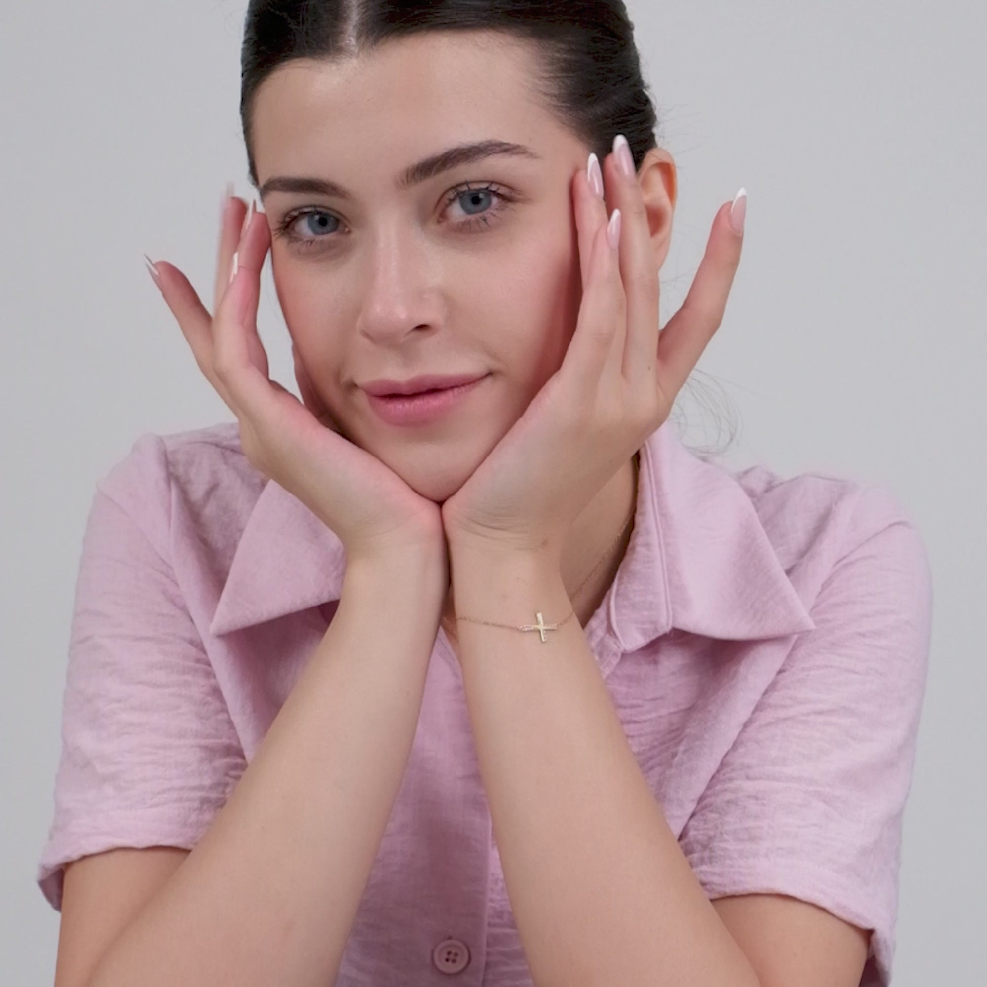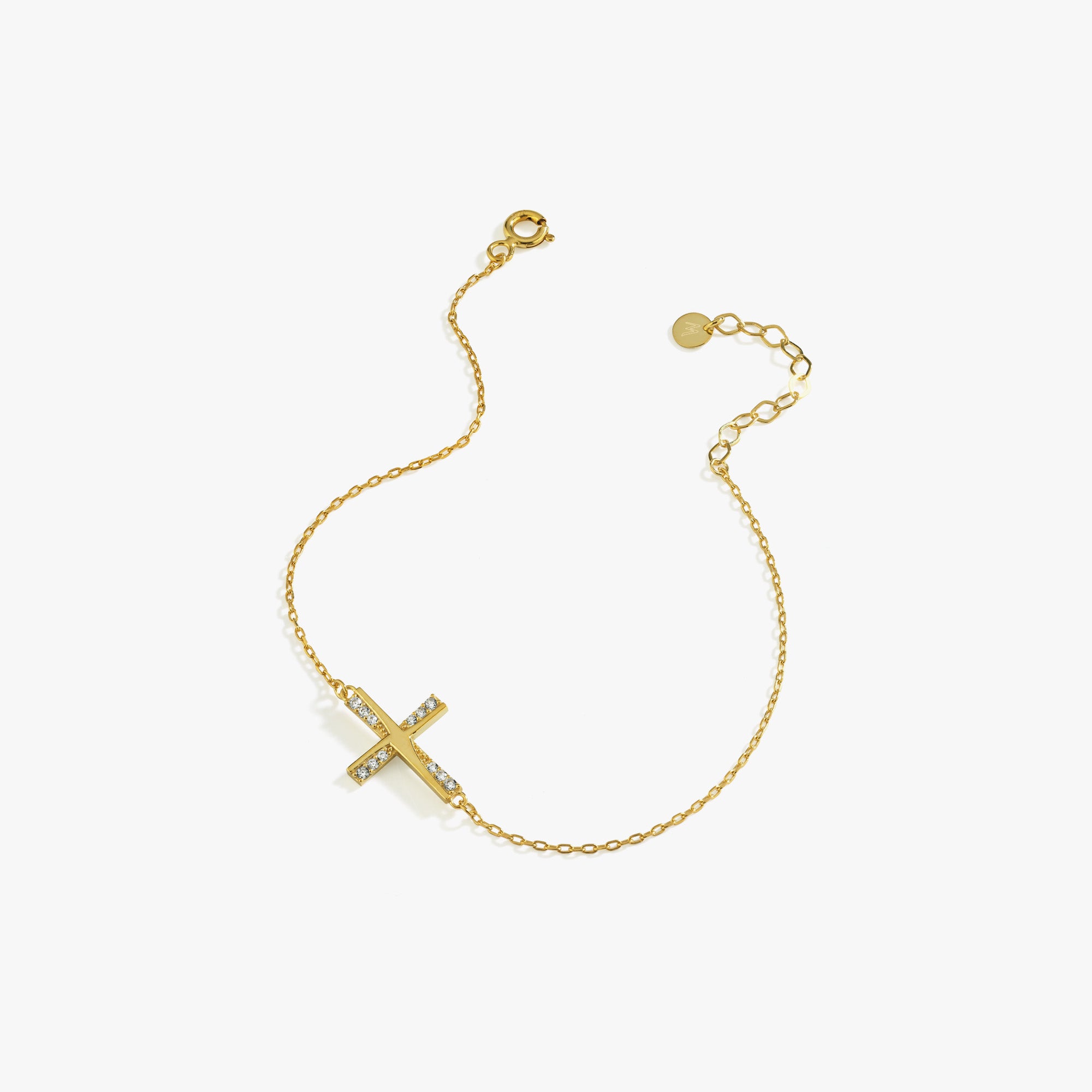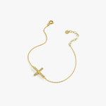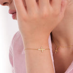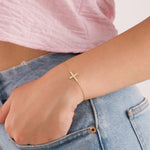 Crafted in your choice of 14K solid gold or gold plated on sterling silver, this Dainty Sideways Cross Bracelet features a 0.75-inch cross adorned with sparkling cubic zirconia stones. A graceful symbol of faith and love, it's perfect for daily wear, meaningful gifting, or keeping close as a personal reminder.