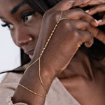 This hand chain is made from 18K Gold Vermeil. Featuring delicate beaded detailing, the bracelet wraps your wrist and finger with subtle elegance. Lightweight and refined, it’s perfect for stacking or wearing solo as a minimalist statement.