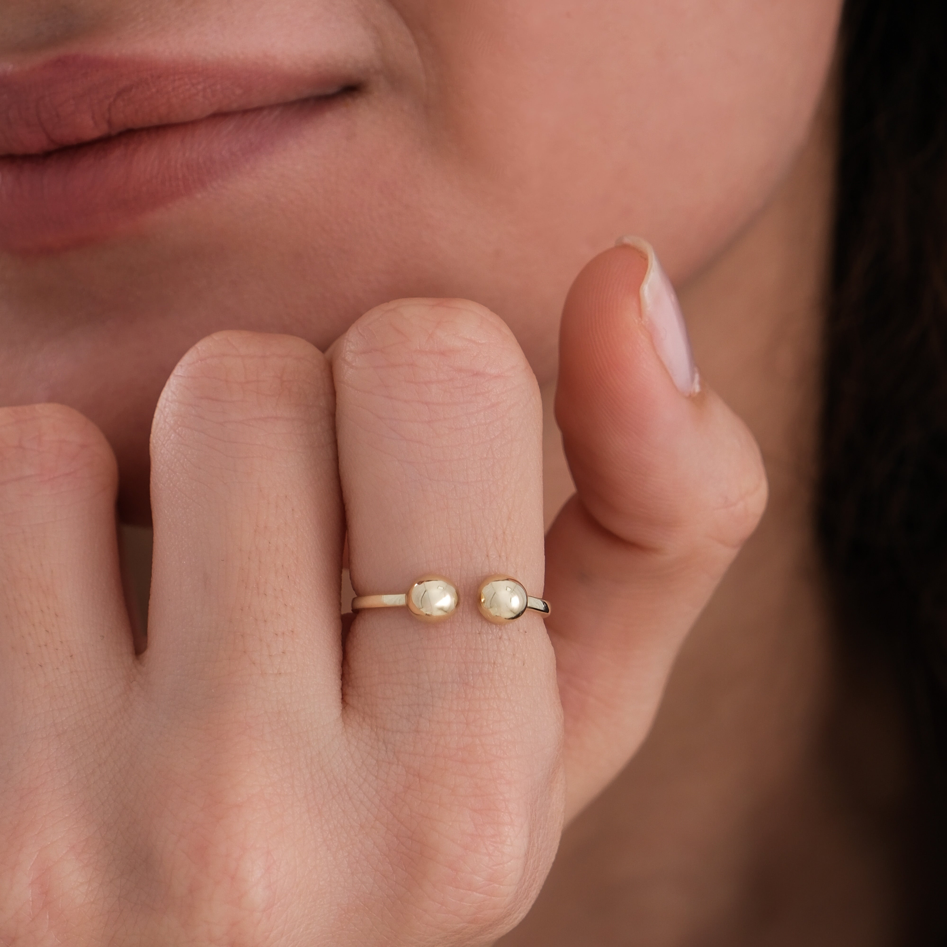 The Double Ball Open Ring in 14K Solid Gold is a modern take on minimalist design. Featuring two polished spheres at each end of an open band, it combines simplicity with balance and sophistication. Perfect for stacking or wearing solo, this sleek ring adds a contemporary touch to any look.