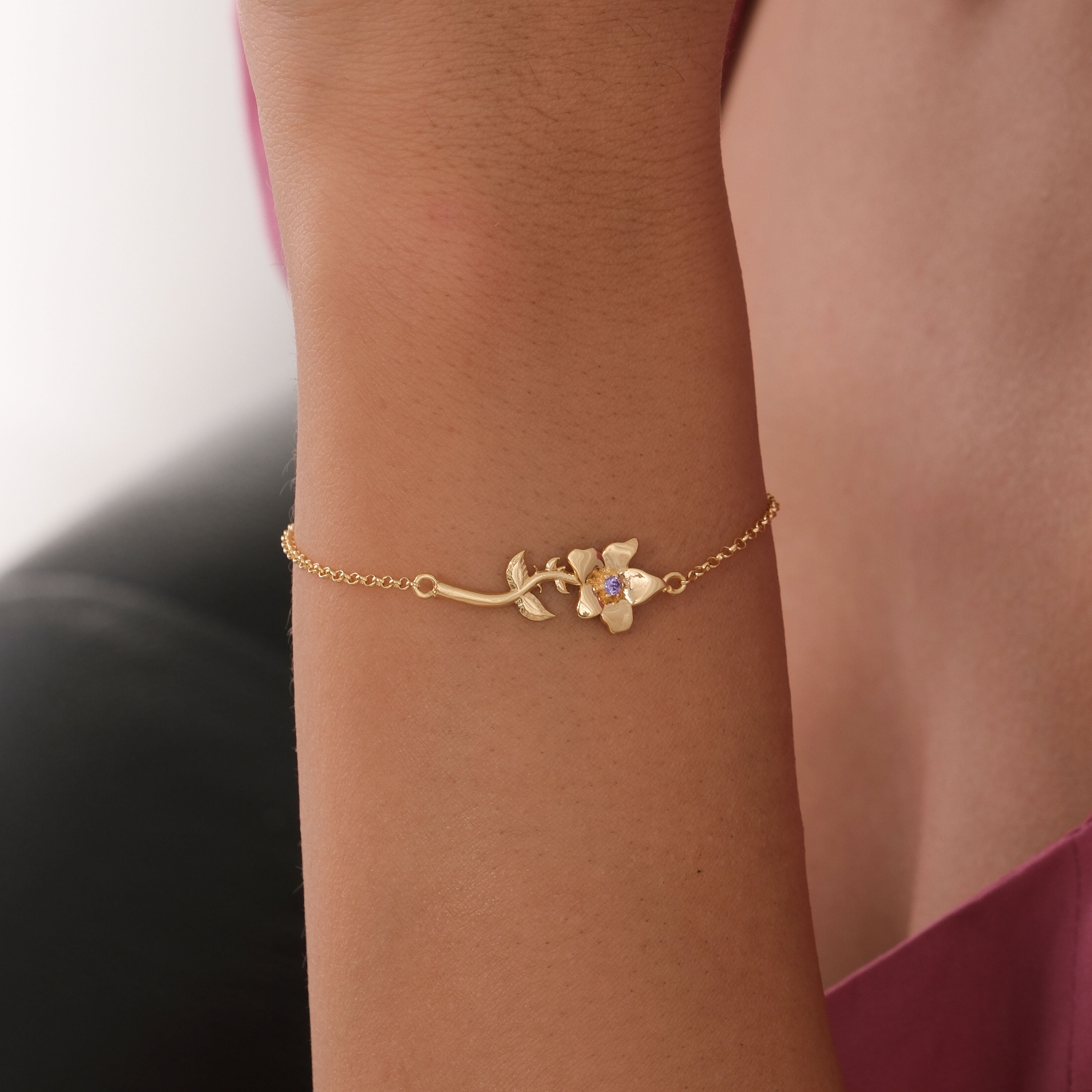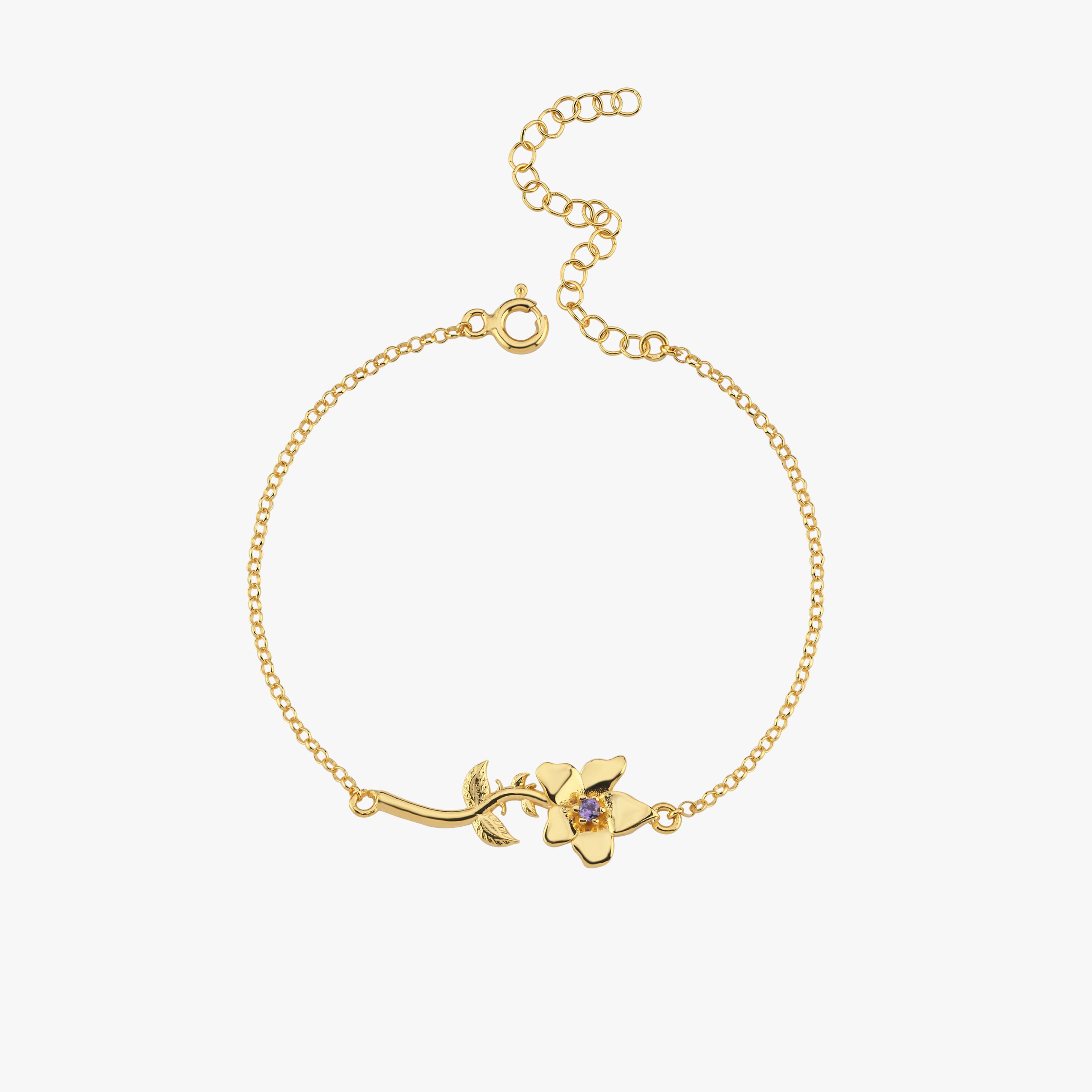 Celebrate February birthdays with this beautifully crafted Birth Flower Bracelet in 18K Gold Vermeil. Featuring a delicate flower design with a sparkling amethyst-inspired center stone, this bracelet symbolizes wisdom, peace, and devotion. The fine chain and adjustable clasp make it perfect for everyday wear or gifting. A thoughtful jewelry piece for birthdays, anniversaries, or simply to honor February’s birth month.