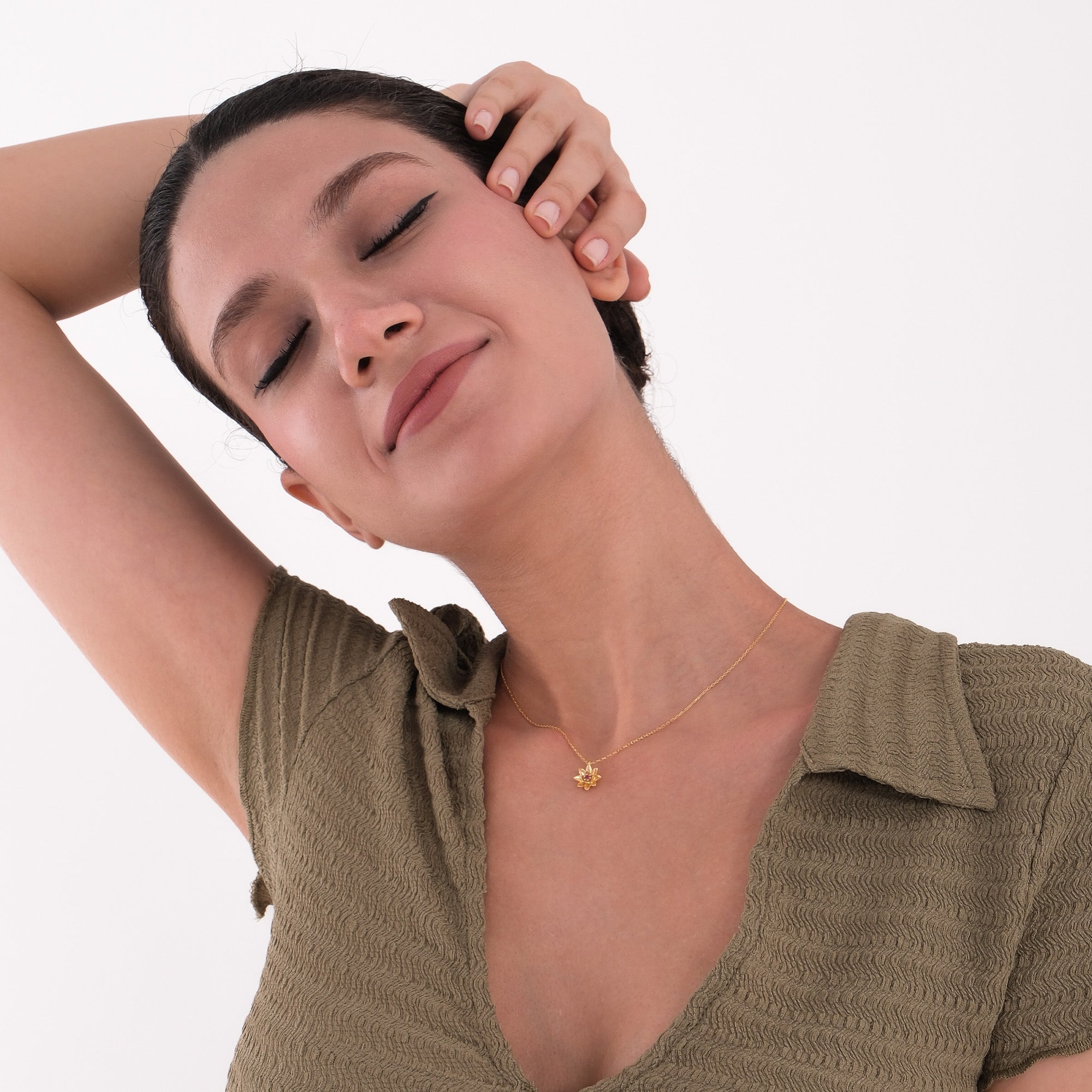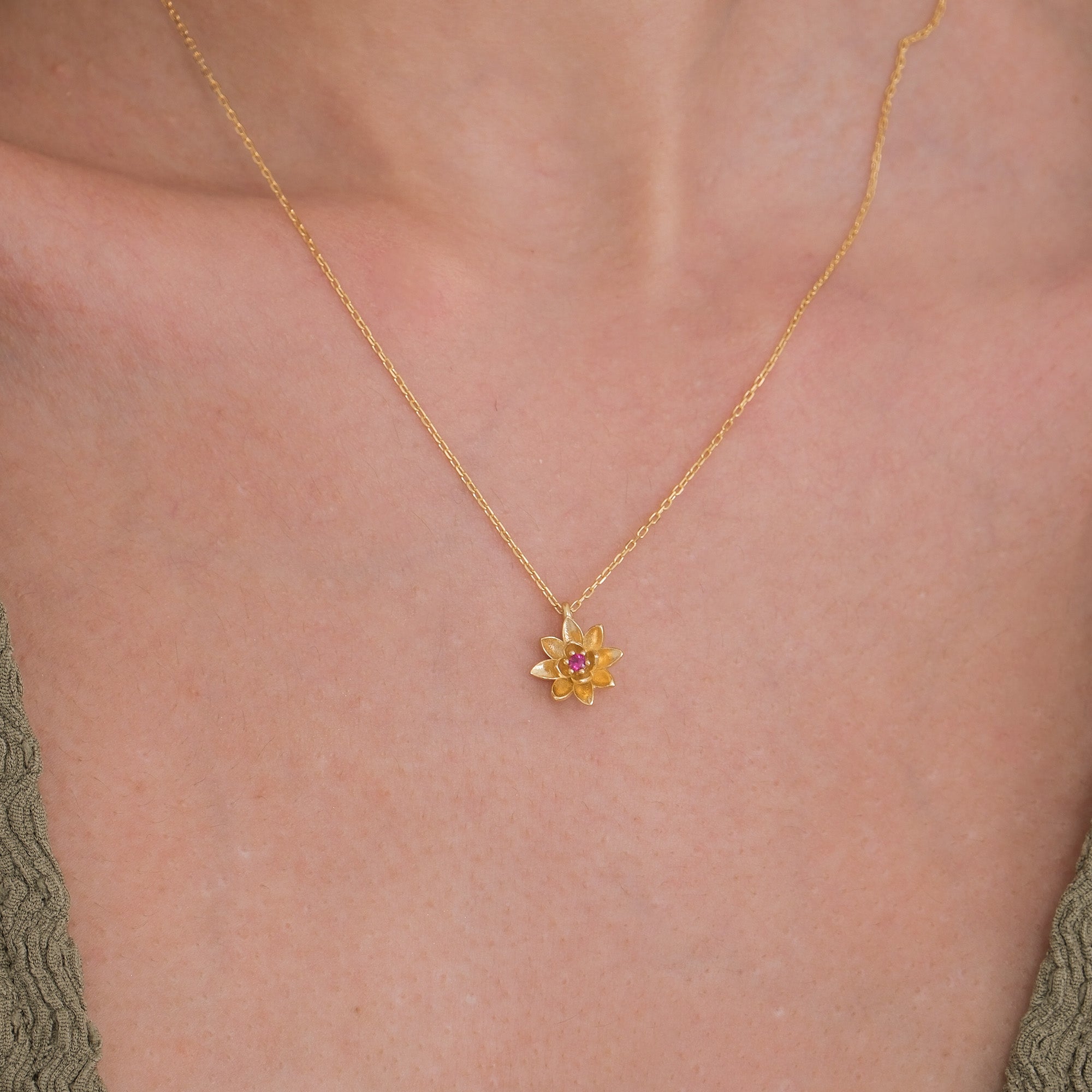 Celebrate July birthdays with our July Birth Flower Necklace, beautifully crafted in 18K gold vermeil on sterling silver. This 0.5-inch pendant features a detailed floral design accented with a vibrant red stone, symbolizing passion and love. A meaningful accessory perfect for everyday wear or a heartfelt birthday gift.