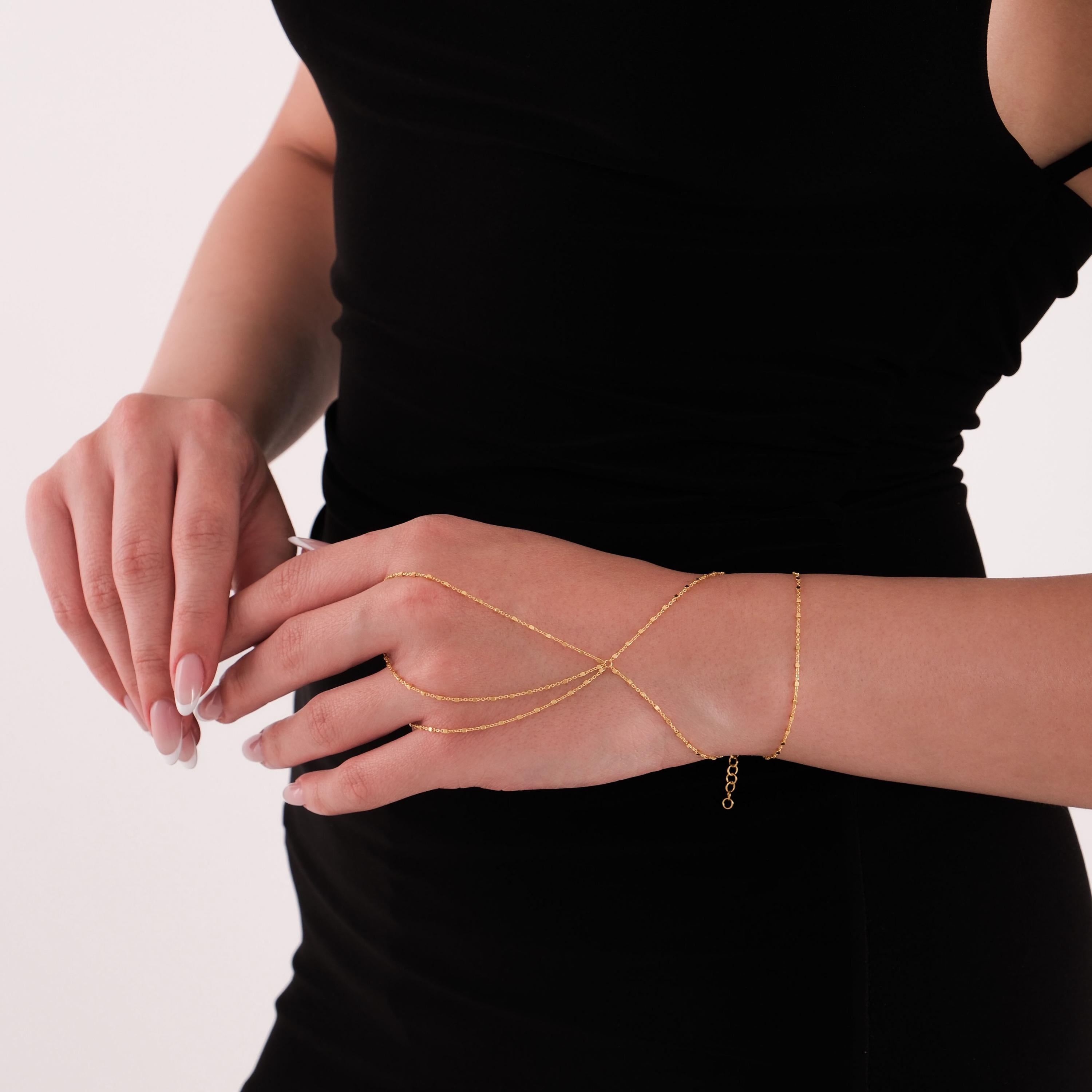 This bracelet is made from 18K gold vermeil and features a triple strand design that wraps elegantly from finger to wrist. A perfect statement piece for summer or as a unique jewelry gift.